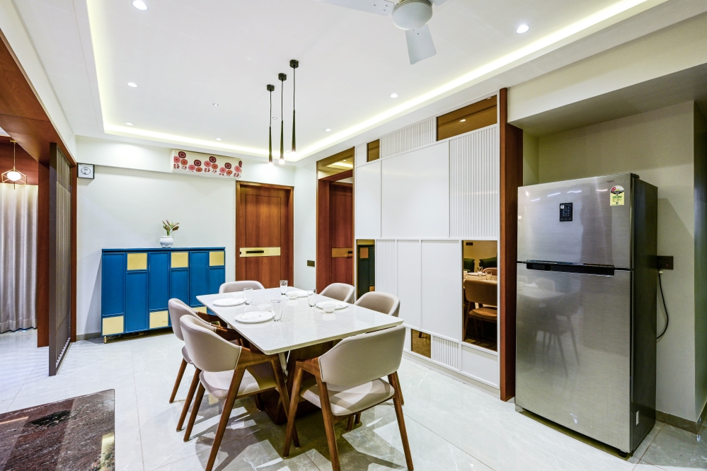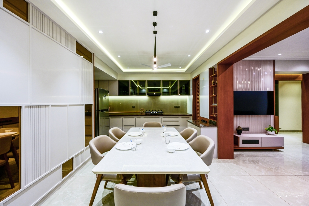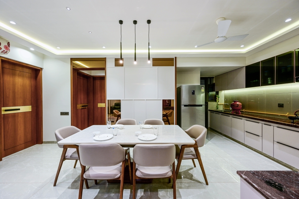 This modern dining area seamlessly blends contemporary design with functional elegance, creating a sophisticated and inviting atmosphere. At its core, a sleek marble dining table is paired with plush upholstered chairs with wooden legs, offering both comfort and style. Surrounded by custom cabinetry and subtle wood finishes, the dining space feels warm yet open. Pendant lighting fixtures above the dining table lend a modern sculptural touch. The classic console unit provides a soothing backdrop, allowing the fine craftsmanship and design details to shine through effortlessly.