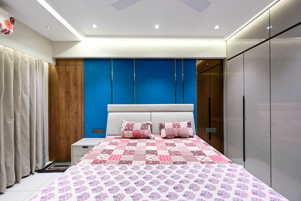The vibrant blue feature panel behind the bed introduces a refreshing pop of colour, infusing the room with a lively yet calming energy. Carefully integrated lighting and clean-lined furniture complete the design, ensuring a perfect blend of utility and understated luxury. The bedroom perfectly balances modern elegance with functionality, creating a sophisticated and comfortable space. A wall-to-wall wardrobe, finished in a glossy beige tone with minimalist black handles, offers ample storage while maintaining a clean, clutter-free look. A wooden and mirrored storage unit reflects light, visually expanding the room, while a floating white console and framed photograph add a personal touch.
