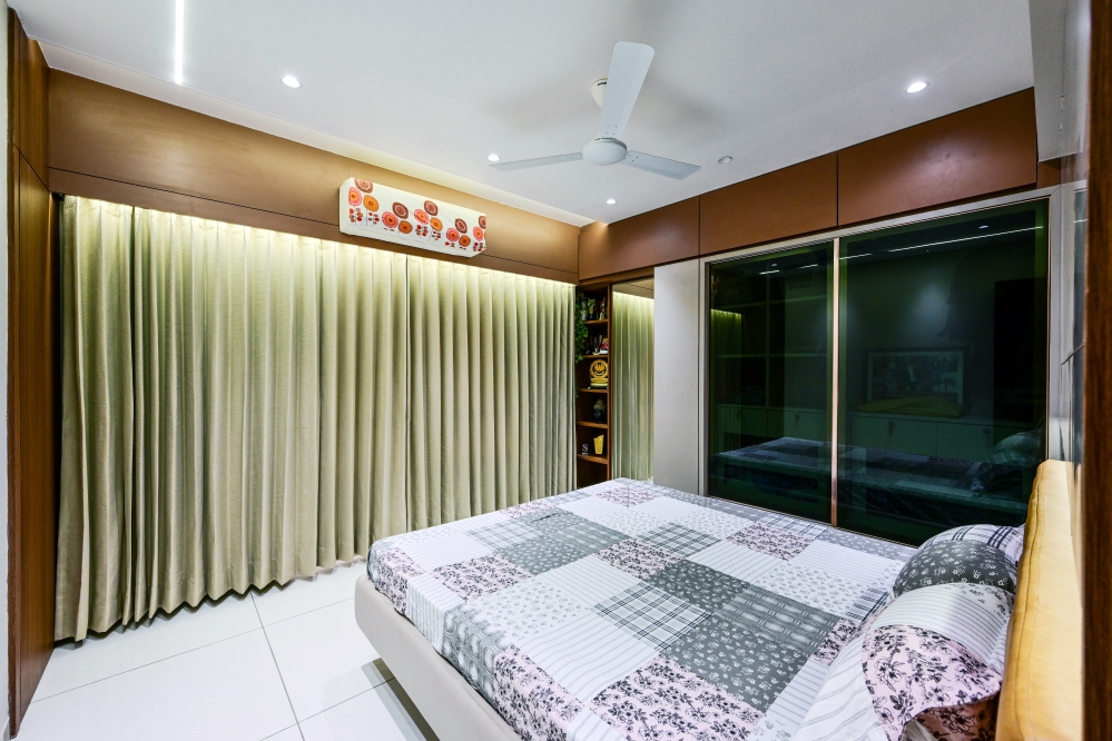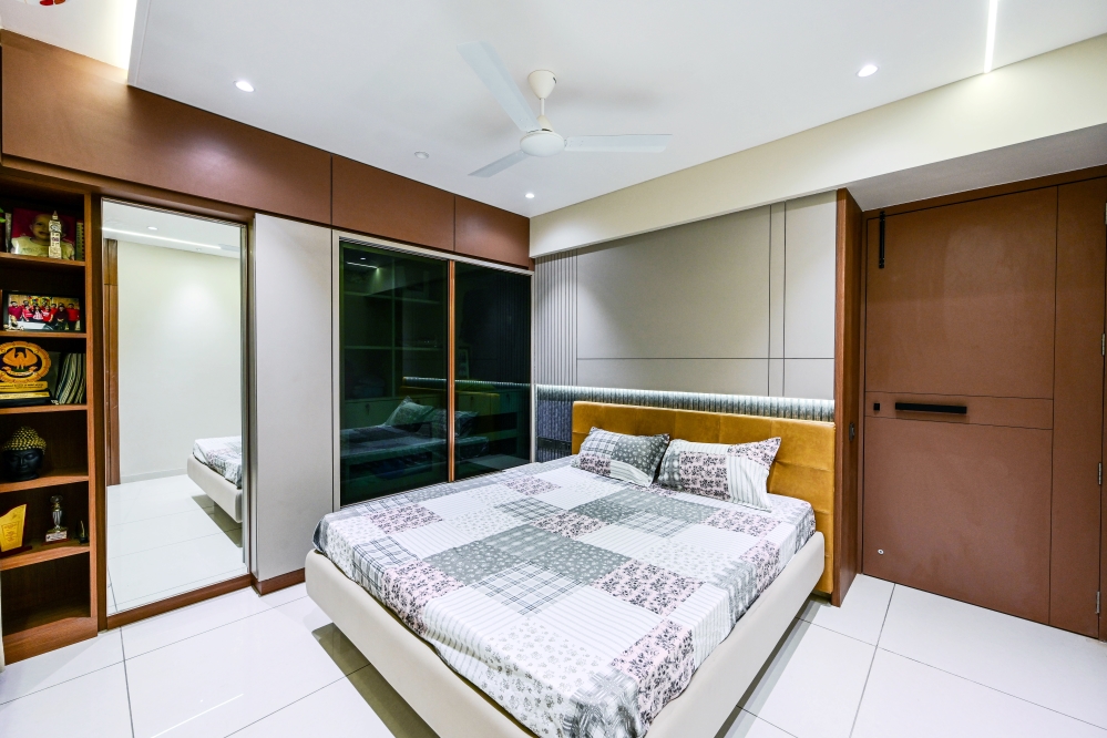 This beautifully curated bedroom seamlessly blends modern sophistication with a warm, inviting ambience, creating an ideal haven for rest. The plush upholstered bed, crowned with a striking mustard yellow headboard adorned with textured detailing, commands attention while offering a rich contrast against the soft neutral-toned accent wall. Complementary wooden accents and built-in wardrobes with back-painted glass surfaces enhance the visual appeal of the room. Soft ambient lighting and carefully chosen textiles create a layered and cosy environment, making the bedroom a peaceful sanctuary designed for comfort and rejuvenation.