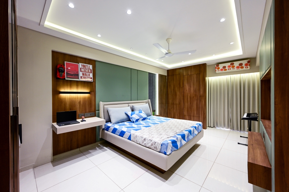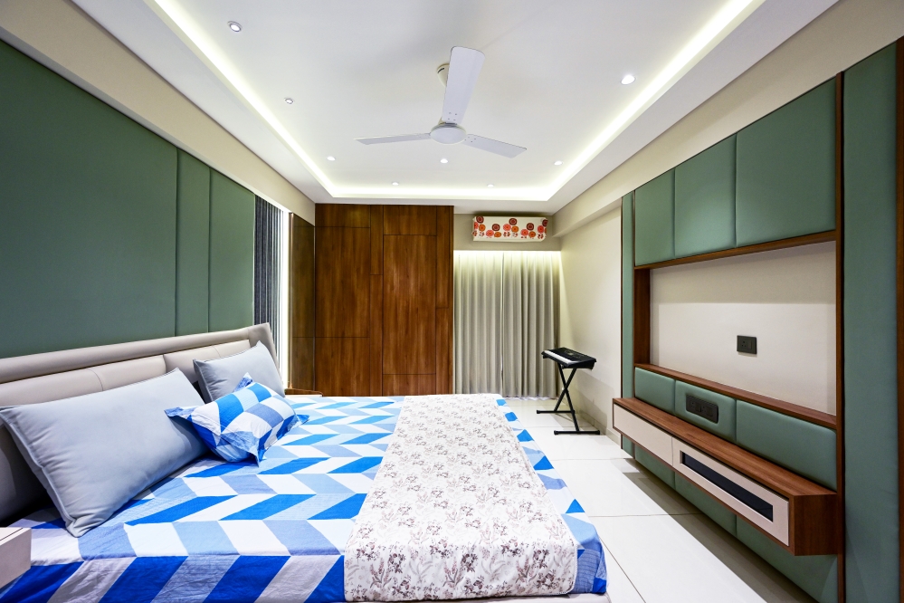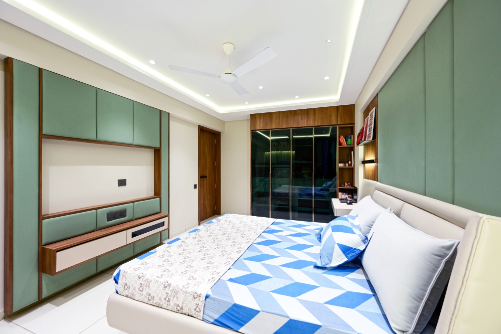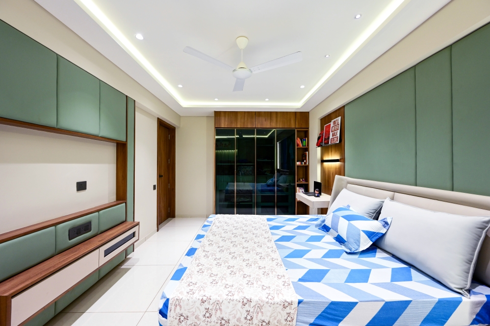 The bedroom is designed elegantly, sophisticatedly with warmth and functionality, creating a space that is both stylish and inviting. That embodies a harmonious blend of earthy tones, natural textures, and sleek contemporary elements, creating a serene and inviting ambience. The feature wall behind the bed is clad in soft green upholstered panels, creating a sophisticated backdrop that adds warmth and depth. Complementing this setting with a custom-designed TV unit with seamless finishes and integrated lighting that enhances the room’s clean, expansive feel. The floated working desk and subtle ceiling accents further elevate the relaxed yet polished atmosphere, offering a perfect retreat for unwinding.