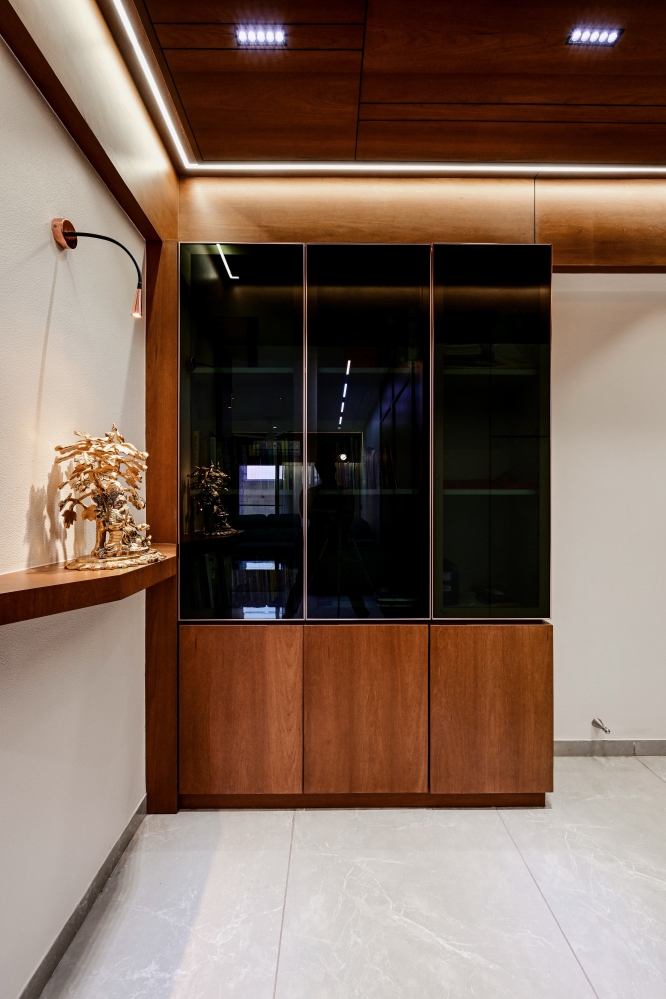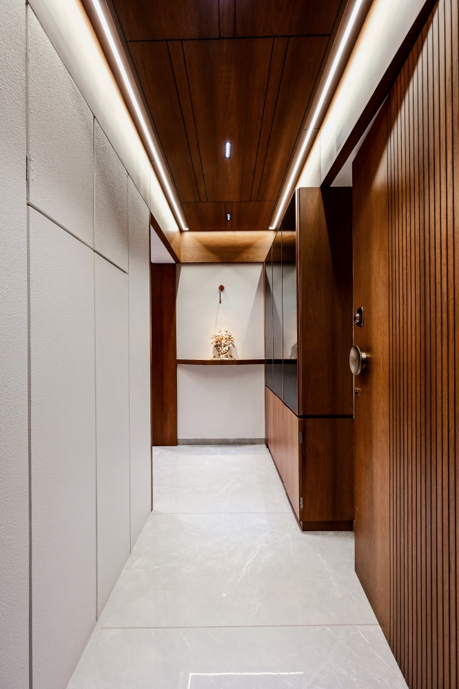 The entrance and foyer area set a welcoming tone with clean lines, warm wooden textures, and a sleek, contemporary aesthetic. Thoughtfully designed niches, integrated lighting, an eye-pleasing artefact and layered finishes create a sense of refined sophistication. Every detail, from the built-in cabinetry to the subtle textures on the walls, reflects a focus on simplicity and understated elegance, making the arrival experience both functional and inviting.
