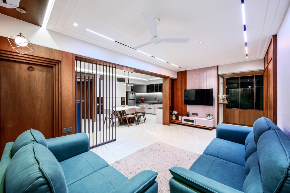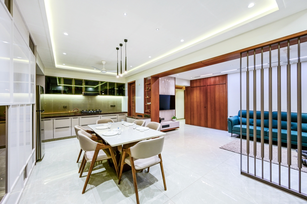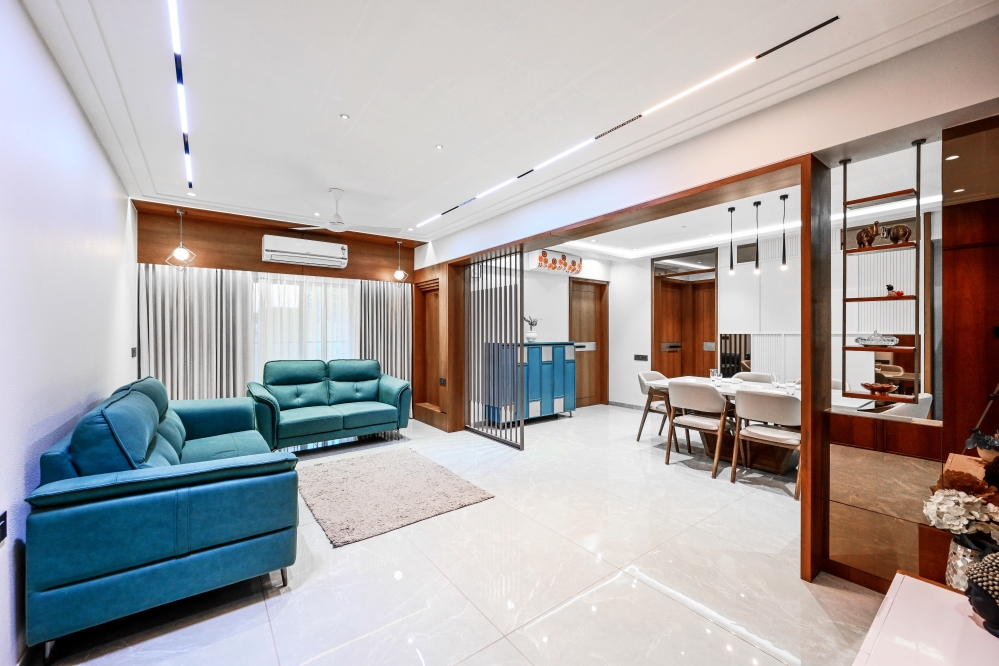 The Principal Designer shares that the core idea behind Dhiraj was to craft an environment where modern aesthetics meet inviting warmth. ID Umesh Suthar envisioned each space with an emphasis on fluidity, comfort, and style, ensuring a cohesive and elegant visual story. This exquisite apartment offers a perfect blend of luxury and contemporary living. Designed with a modern aesthetic, the apartment features a sleek, sophisticated colour palette that complements its upscale ambience.