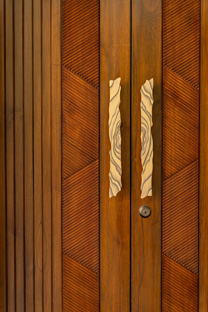 The entrance features a striking stone-cladded wall complemented by an eye-catching wooden main door with stylish handles that instantly create a welcoming impression.  The foyer is defined by fluted panelling, a functional storage unit, and well-placed lighting fixtures that add depth with sophistication while maintaining a clutter-free aesthetic.