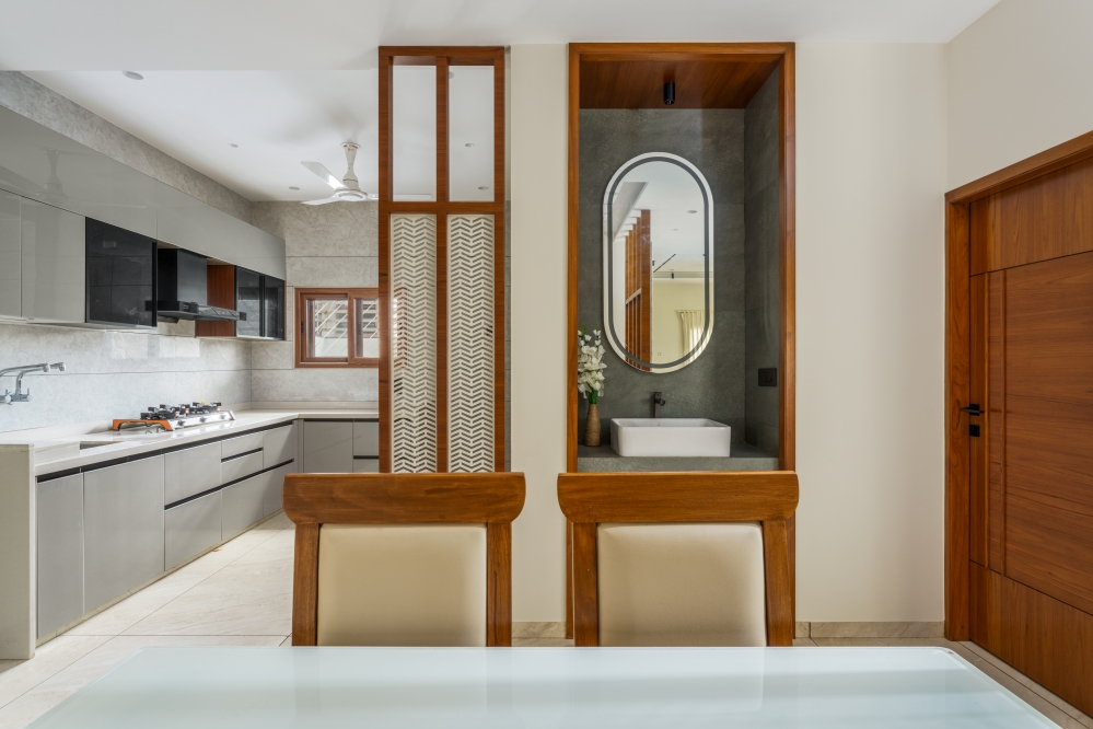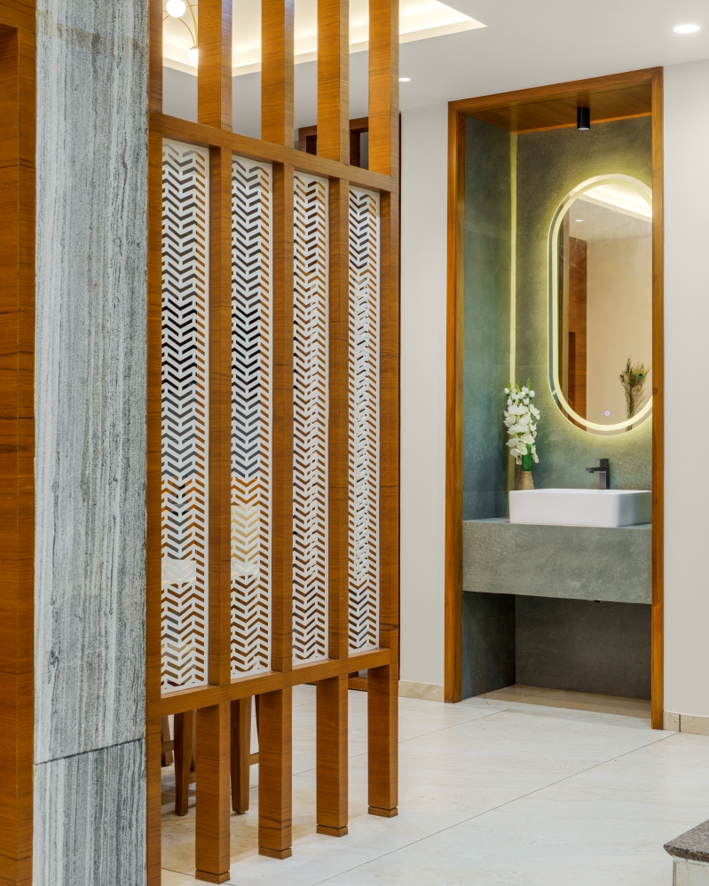 The dining area radiates elegance with a contemporary dining table and classic chairs that blend style with comfort. A wooden partition introduces partial separation while maintaining flow. The space is accentuated by modern ambient lighting elegantly. A neatly designed washbasin area, highlighted by a capsule-shaped mirror. Whereas a rustic backdrop and contemporary fixtures add sophistication to the overall setting with a warm lighting setup.
