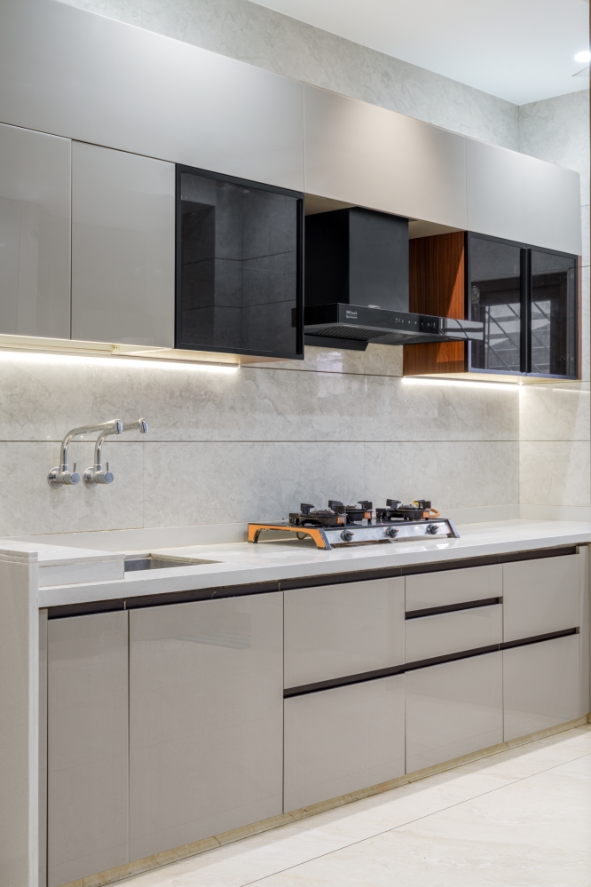 The kitchen reflects a modern, streamlined design with glossy cabinetry, under-cabinet lighting, and neutral grey tones that enhance functionality and aesthetics. White countertops paired with sleek shutters with concealed handles give the kitchen a seamless and modern appearance. The elegant display shelving enhances visual appeal while maintaining functionality, resulting in a bright and well-organised cooking space.