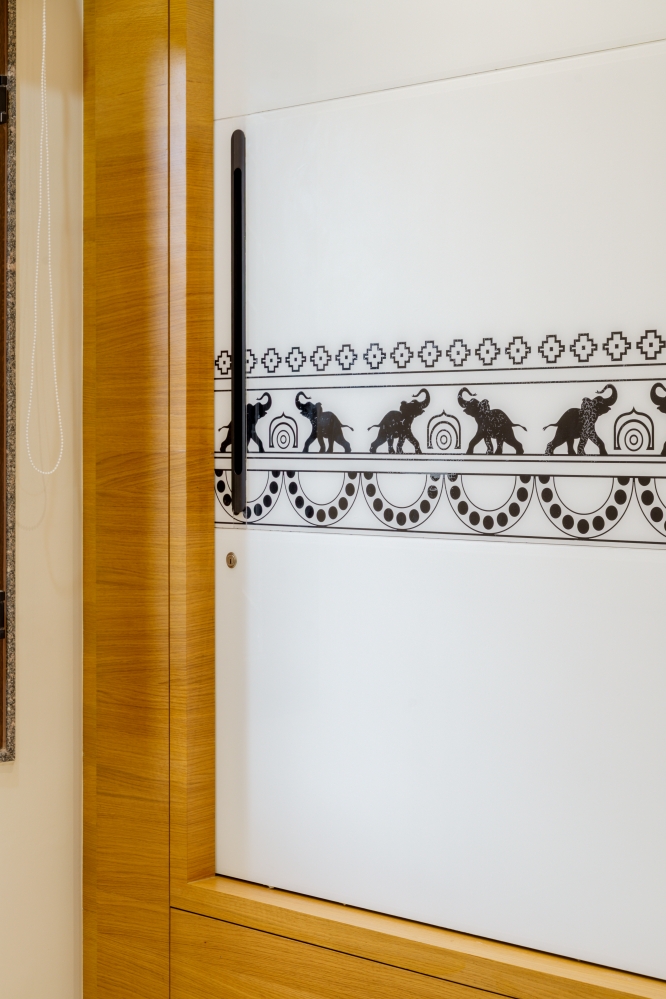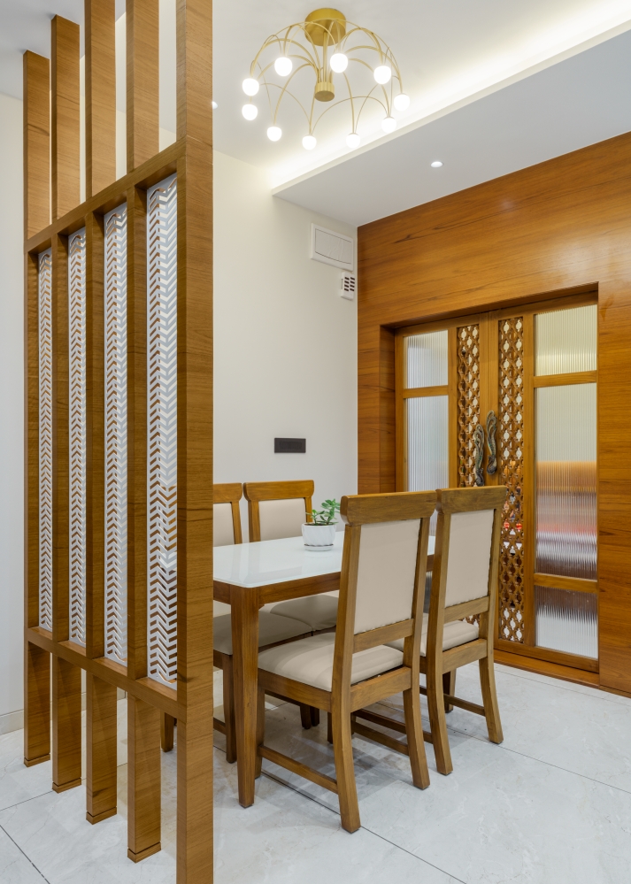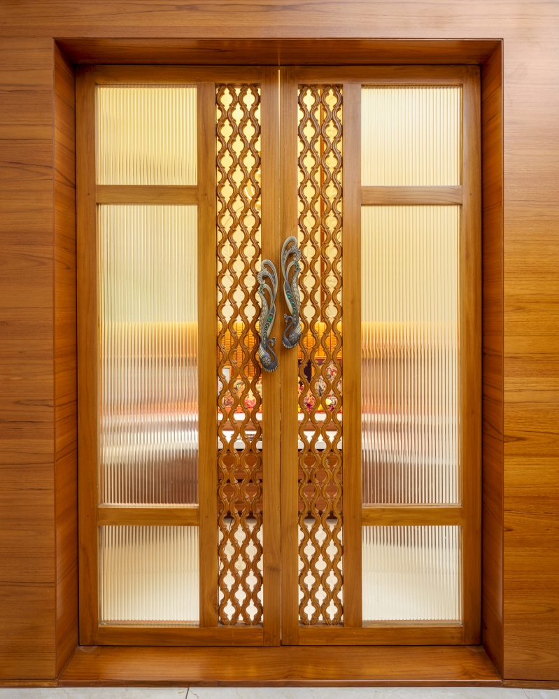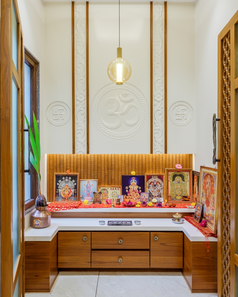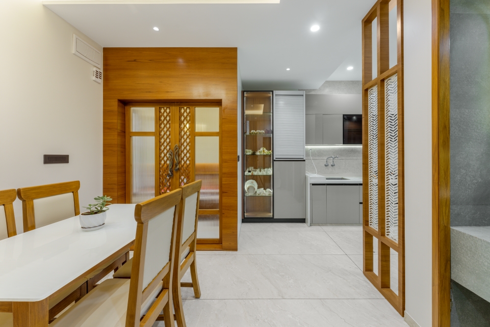 Adjacent to the dining area, the mandir features a serene combination of wood and soft lighting, creating a spiritual ambience. The mandir area exudes serenity with its ornate wooden doors, intricate carvings, and eye-catching handles. The soft-toned backdrop embossed with Om, Swastik and floral motifs adds a divine aura, while the wooden drawers offer functionality with elegance. Subtle illumination enhances the sacred atmosphere, creating a peaceful and spiritually uplifting corner within the home.