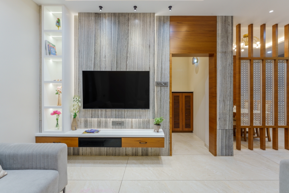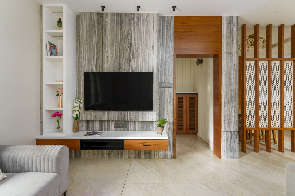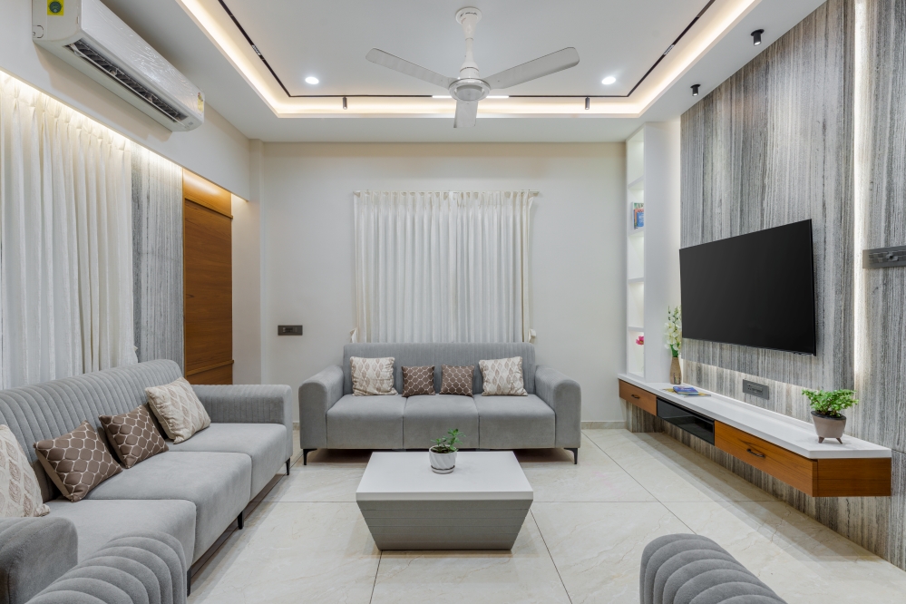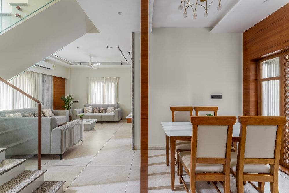 The living room exudes warmth through a refined blend of neutral-toned sofas, elegant wall panelling, and soft curtains that filter natural light beautifully. A sleek TV unit with elegant panelling and wooden accents forms the focal point, while the ceiling design enhances spatial drama. The subtle interplay of textures, along with artefacts and décor elements, adds charm. A well-designed partition subtly separates the dining area, maintaining openness yet offering visual distinction.