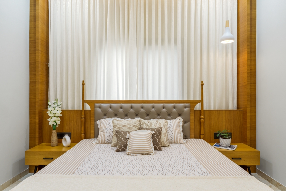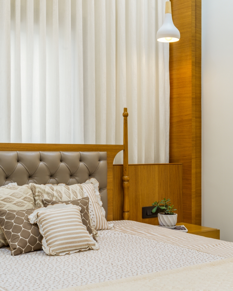 This classic bedroom embodies elegance with a cosy bed framed by a plush headrest with wooden accents and curtains, complemented by warm lighting fixtures. The sober ceiling design enhances serenity, while an earthy-toned wardrobe with an inbuilt dressing unit provides seamless storage. The decor’s simplicity and muted tones evoke a sense of refined comfort.