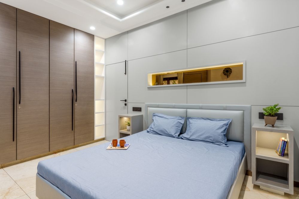 This modern bedroom showcases minimalism through a sleek bed’s headrest, clean panelling, and subtle lighting fixtures. The soothing colour palette complements a modern wardrobe with open white shelf units, offering both function and style. Carefully chosen accessories and soft furnishings enhance comfort, giving the room a contemporary, calming aura.