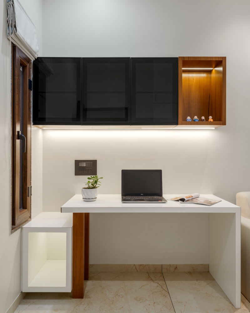 The working area is designed with simplicity and efficiency in mind, featuring a sleek white desk, minimal storage, and underlit wall cabinets in black and wood tones. Natural light from the adjacent window complements the soft artificial lighting, creating a bright, focused, and aesthetically balanced environment ideal for productivity and calm concentration.
