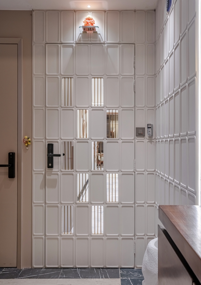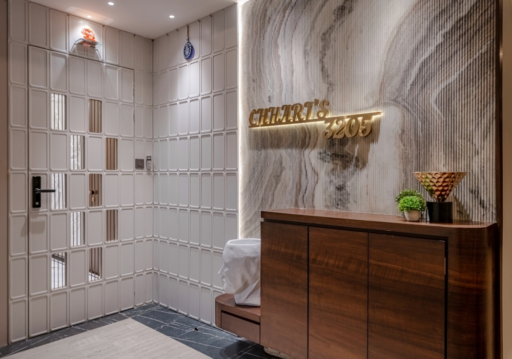 The entrance is crafted as a refined threshold, featuring highlighter fluted marble that draws the eye without excess. A compact shoe rack integrated with seating ensures functionality within a minimal design framework — welcoming residents and guests alike with understated elegance.