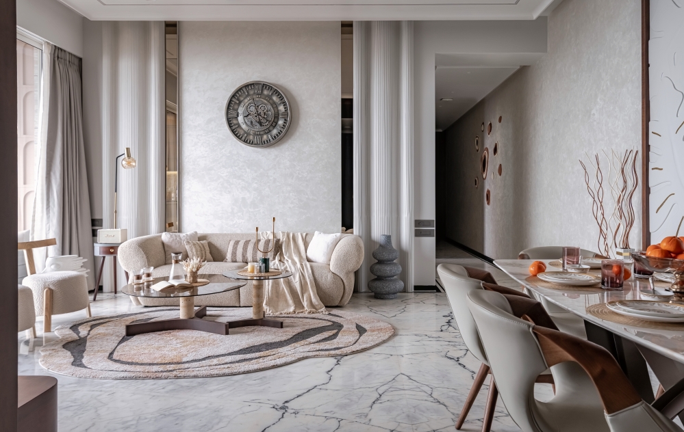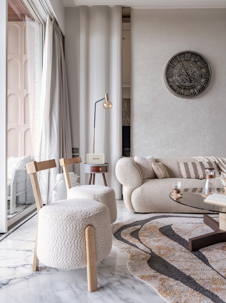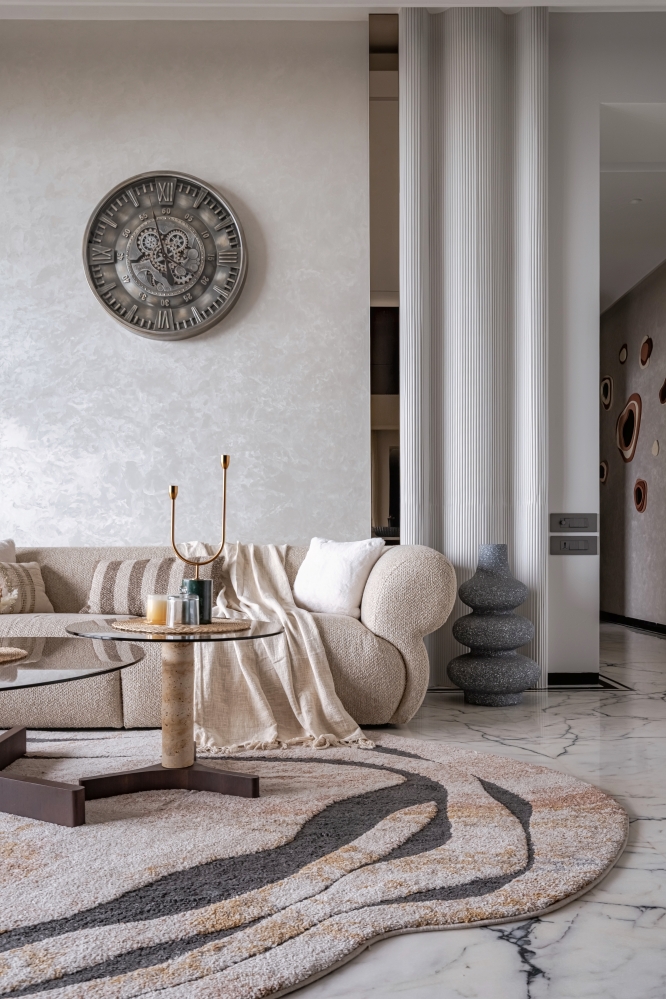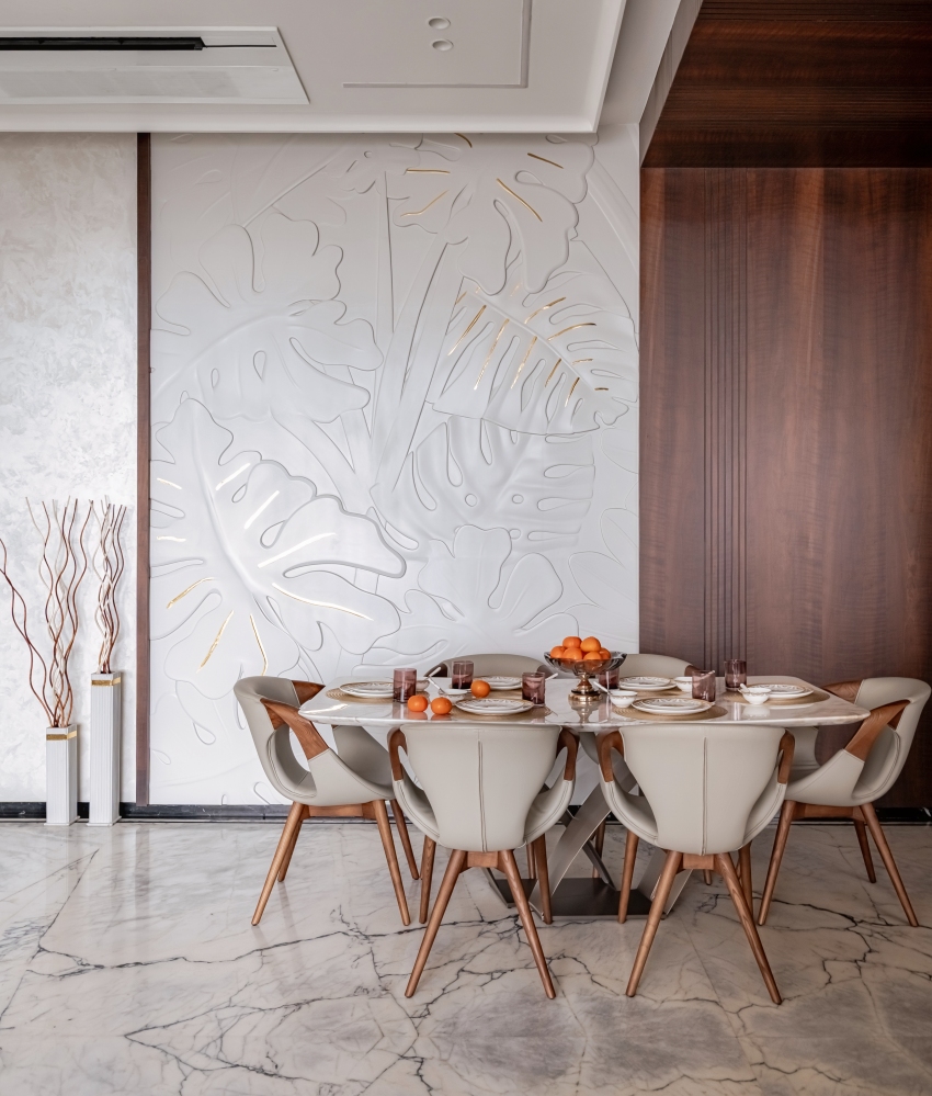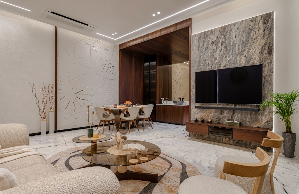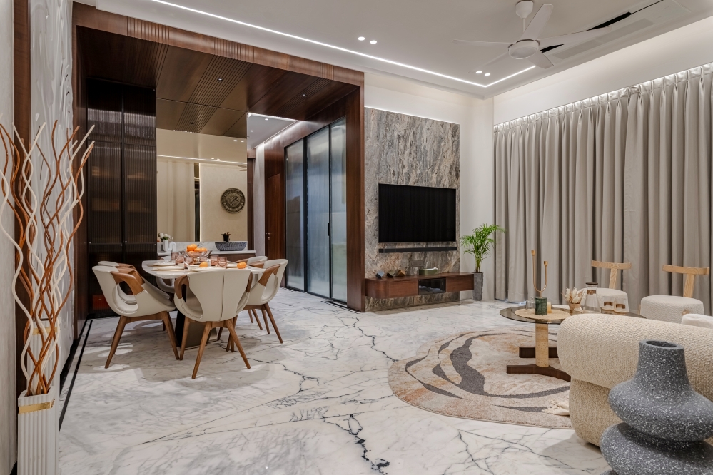 The living area forms the heart of this residence, defined by its sophisticated material play and gentle curves. The TV wall stands out with a striking highlighter marble that flows gracefully into a soft side curve, adding both visual depth and movement. Across the dining wall, a 3D MDF art panel detailed with delicate gold leafing creates an artistic centerpiece — a modern expression of craftsmanship. Behind the sofa, a curved fluted panel pairs seamlessly with a tinted mirror and an antique wall clock, enriching the space with character and balance.