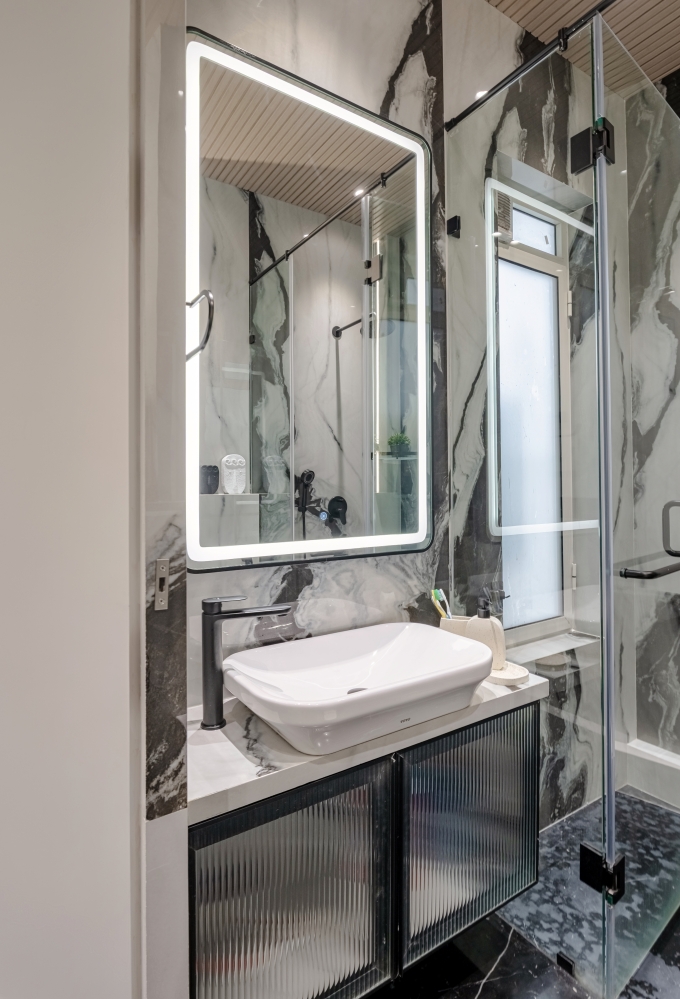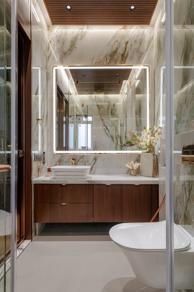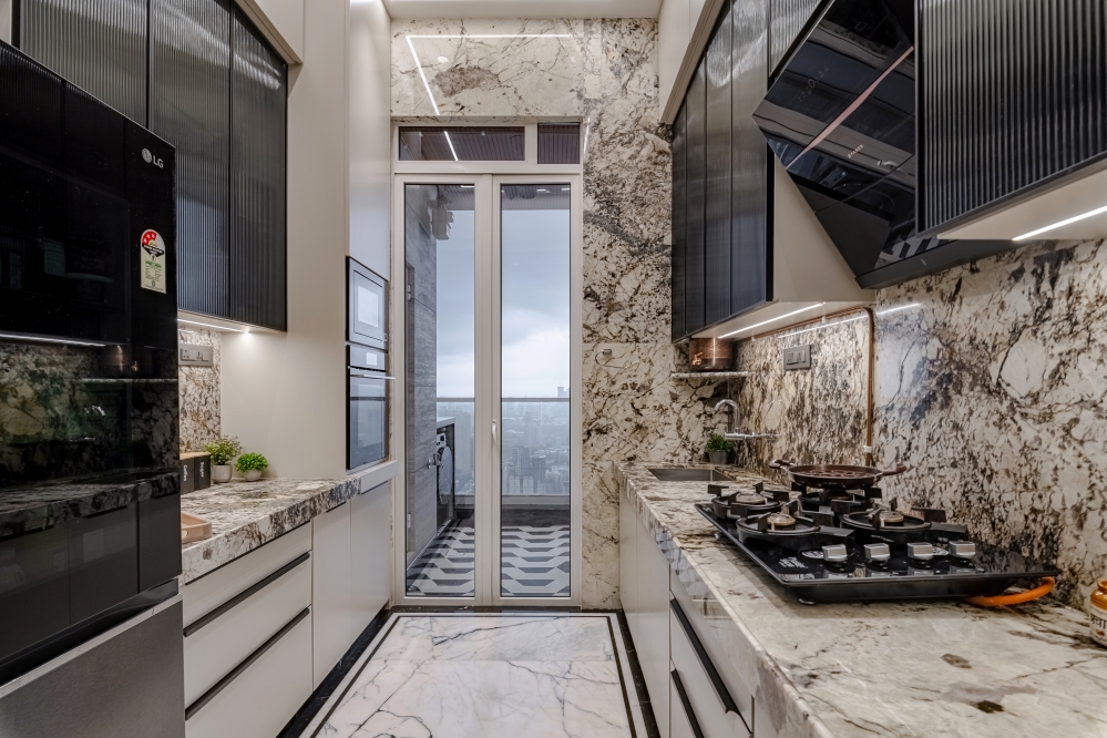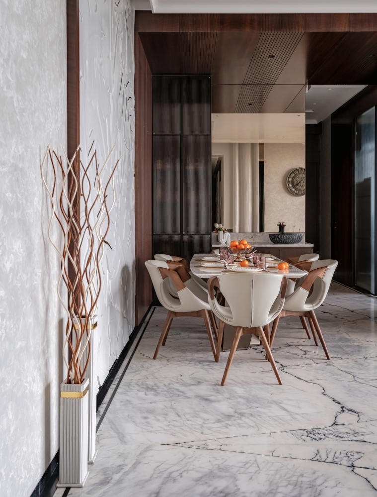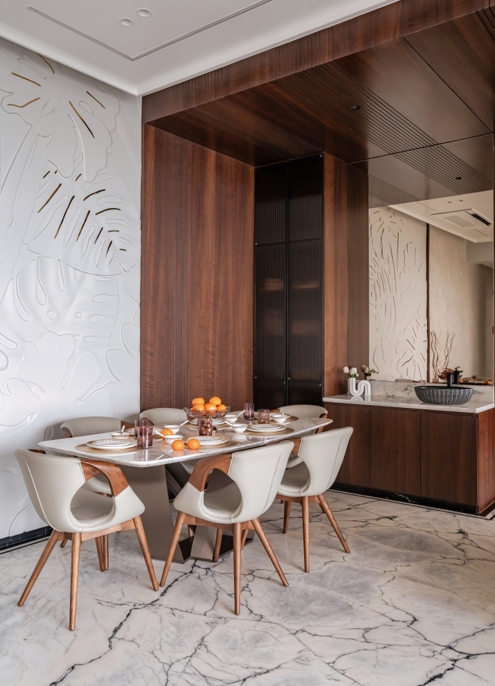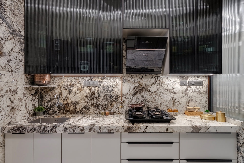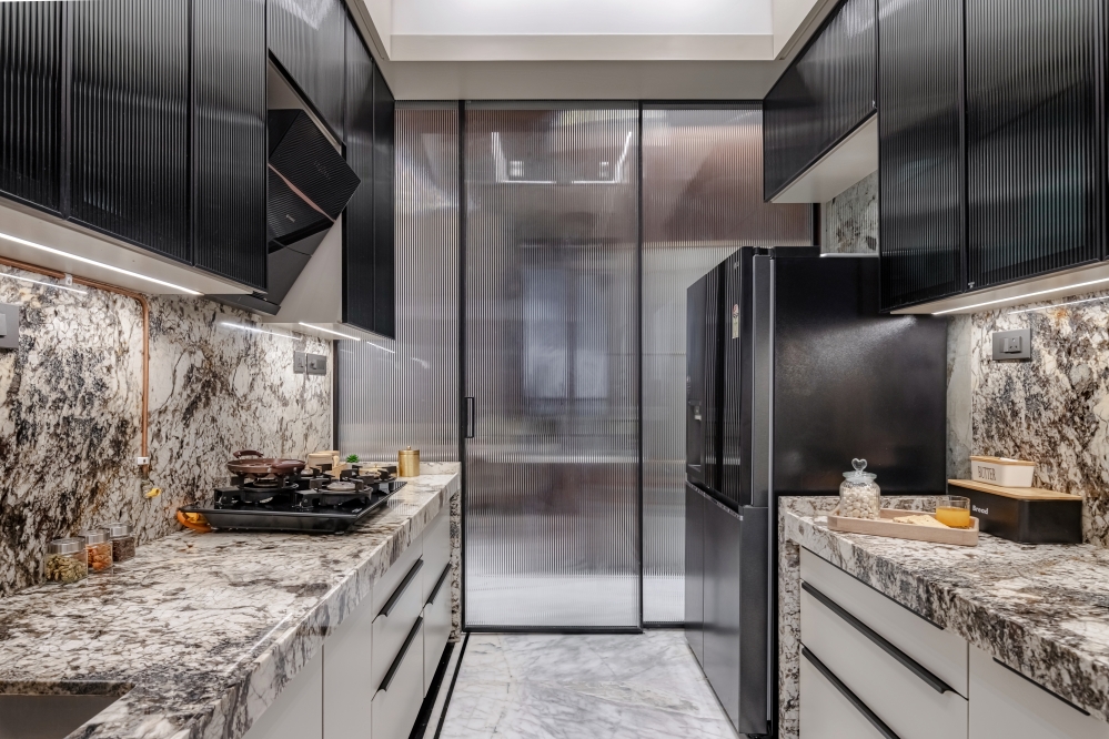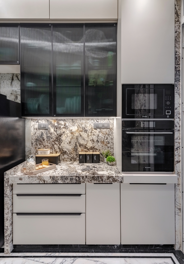 The kitchen combines efficiency with luxury. Quartzite marble forms both the countertop and backsplash, lending durability with a natural sheen. Fluted tinted glass shutters above create a soft play of light and shadow, while the matte white PU finish on the lower cabinets introduces visual calm. The fluted glass sliding partition subtly separates the kitchen from the dining area while preserving openness and connectivity.