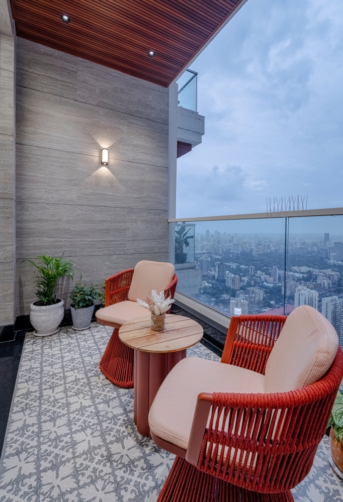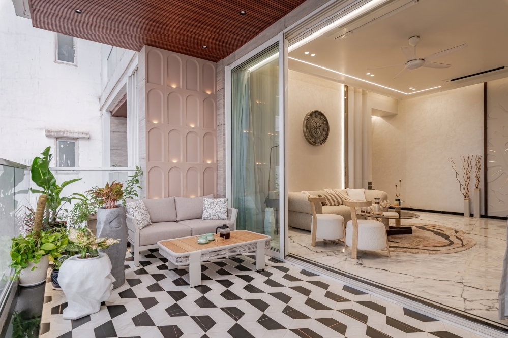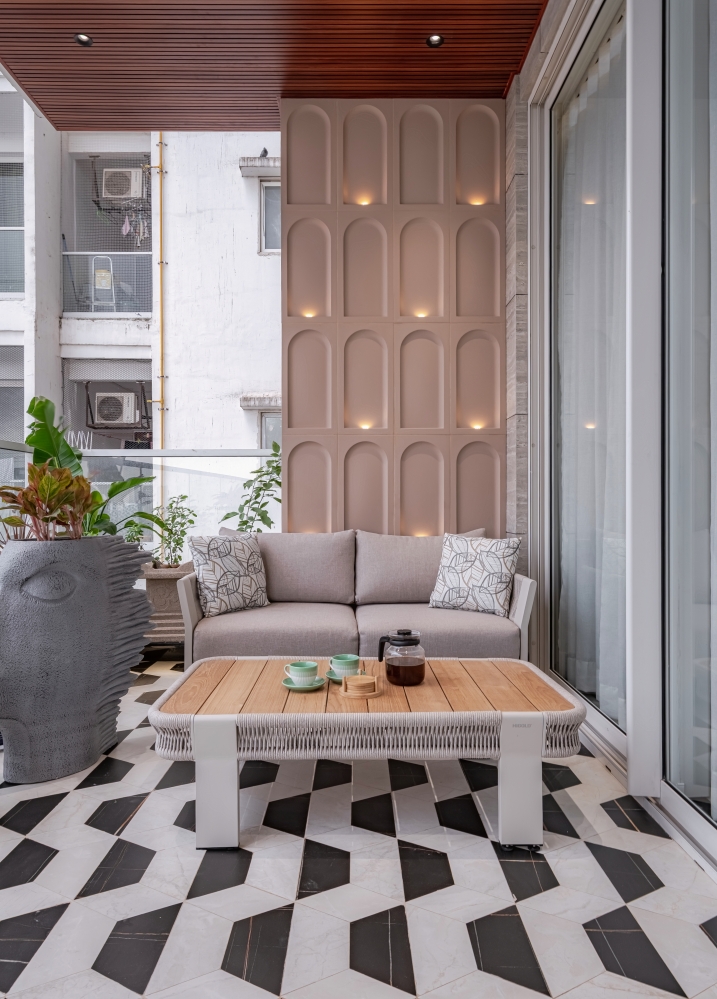An extension of the living room, the balcony offers a serene escape framed in modern detail. The walls feature patterned tiles with in-built lighting, creating a soft evening glow. The flooring showcases an elegant interplay of two marble shades — dark and light — forming a distinctive geometric pattern. A compact bar counter with fluted glass shutters elevates the functionality of this cozy space, making it perfect for leisure evenings and quiet reflections.