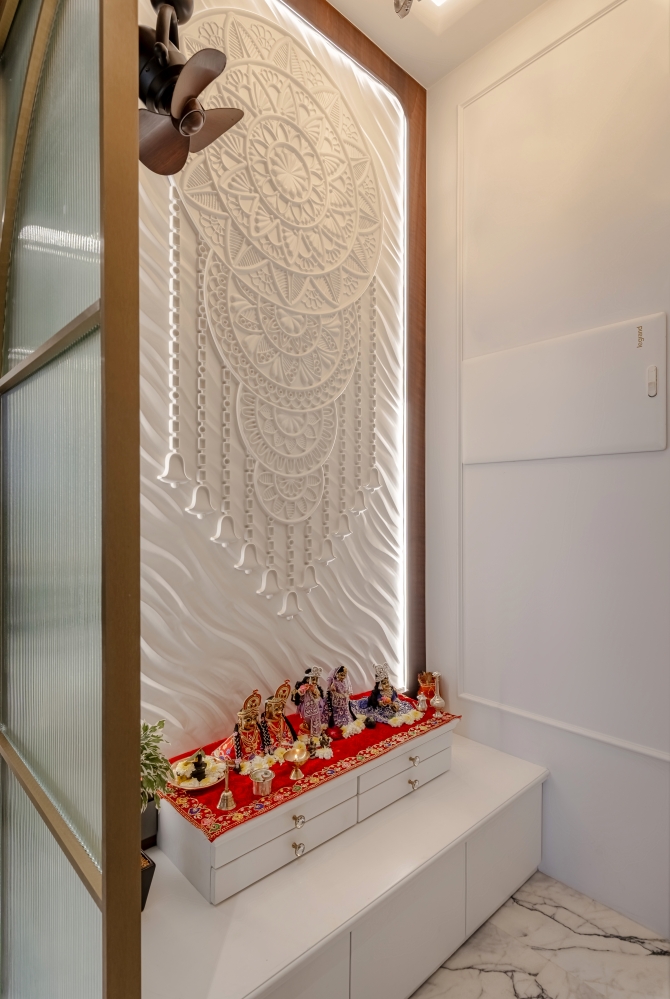 The mandir space radiates tranquility with its intricately sculpted POP wall art that resembles a divine tapestry. Complemented by a delicate chandelier and ample ambient lighting, it transforms devotion into design. The subtle play of textures and contours makes the area spiritually uplifting while maintaining a refined aesthetic that aligns with the home’s contemporary theme.