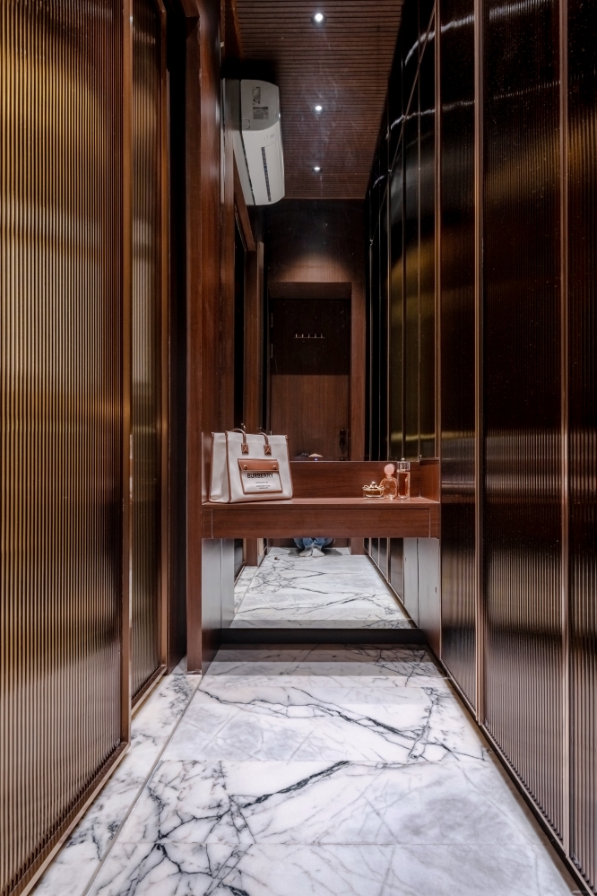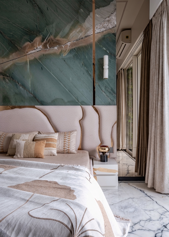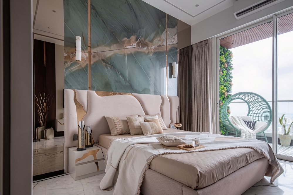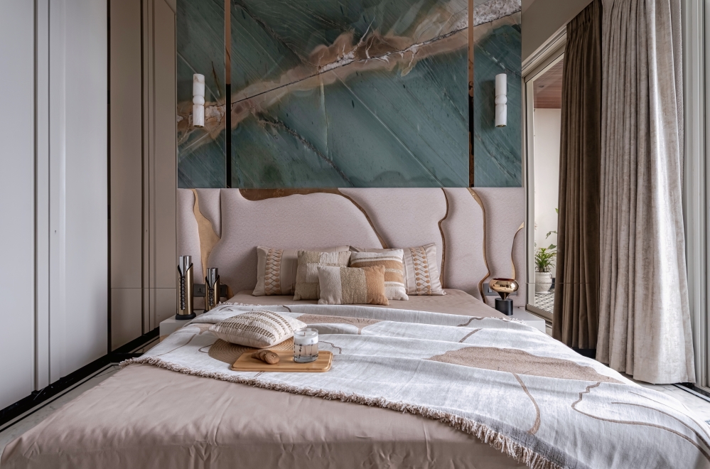 The master bedroom redefines refined luxury with a harmonious blend of materials and craftsmanship. A striking green highlighter marble panel above the bed, accentuated with gold strips and soft wall lights, becomes the room’s focal point. Flanking the bed are tinted full-length mirrors that visually expand the space while reflecting light and depth. The upholstered headboard, detailed with subtle gold leafing, complements the chamfered bed and side tables — both featuring fine detailing that merges modern geometry with traditional artistry.