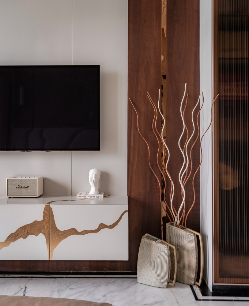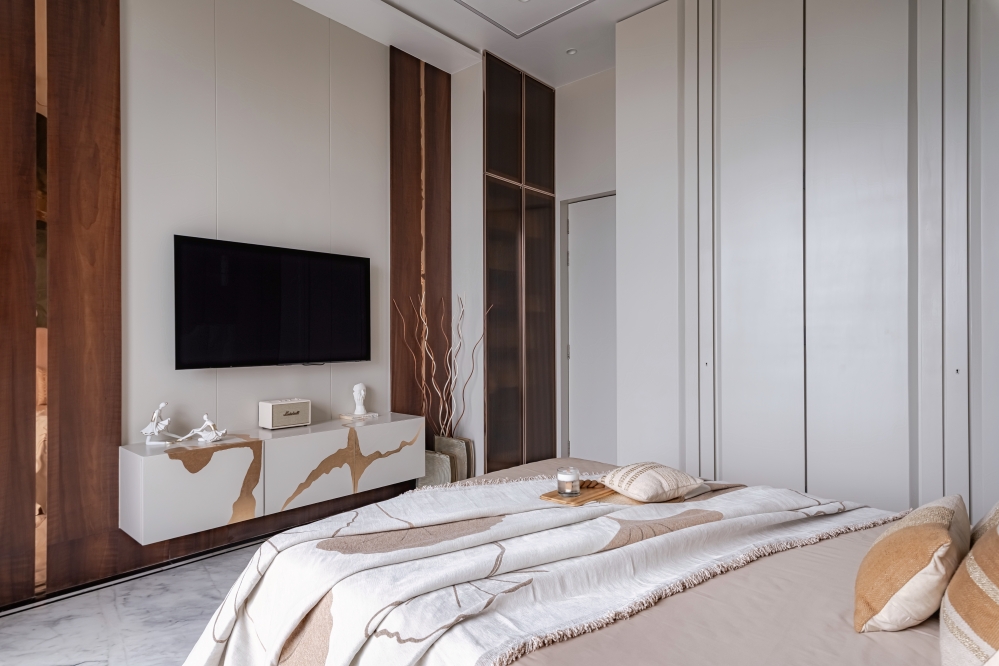 A rich veneer wraps the wardrobe and TV unit, tying the space together through natural warmth. Full-height wardrobe shutters feature concealed handles and a clean vertical rhythm, while additional storage behind the door integrates a fluted design for texture continuity. Gold leafing details appear again on the TV unit, adding a hint of luxury without overpowering the calm palette. Soft lighting, layered textures, and a restrained color palette combine to create an atmosphere of timeless sophistication.