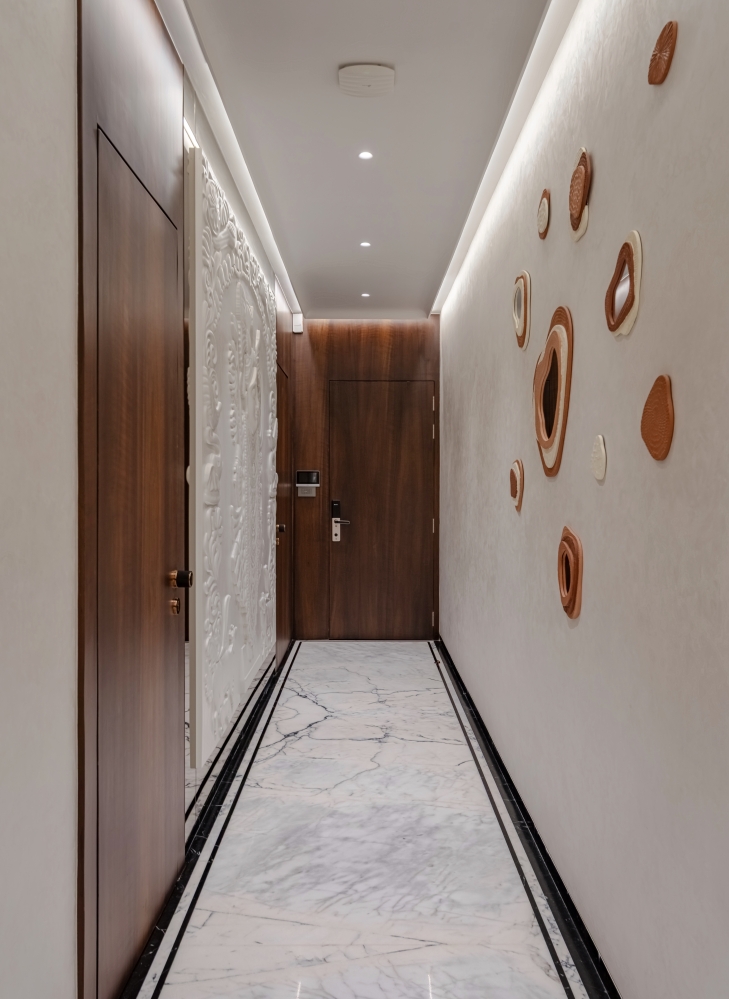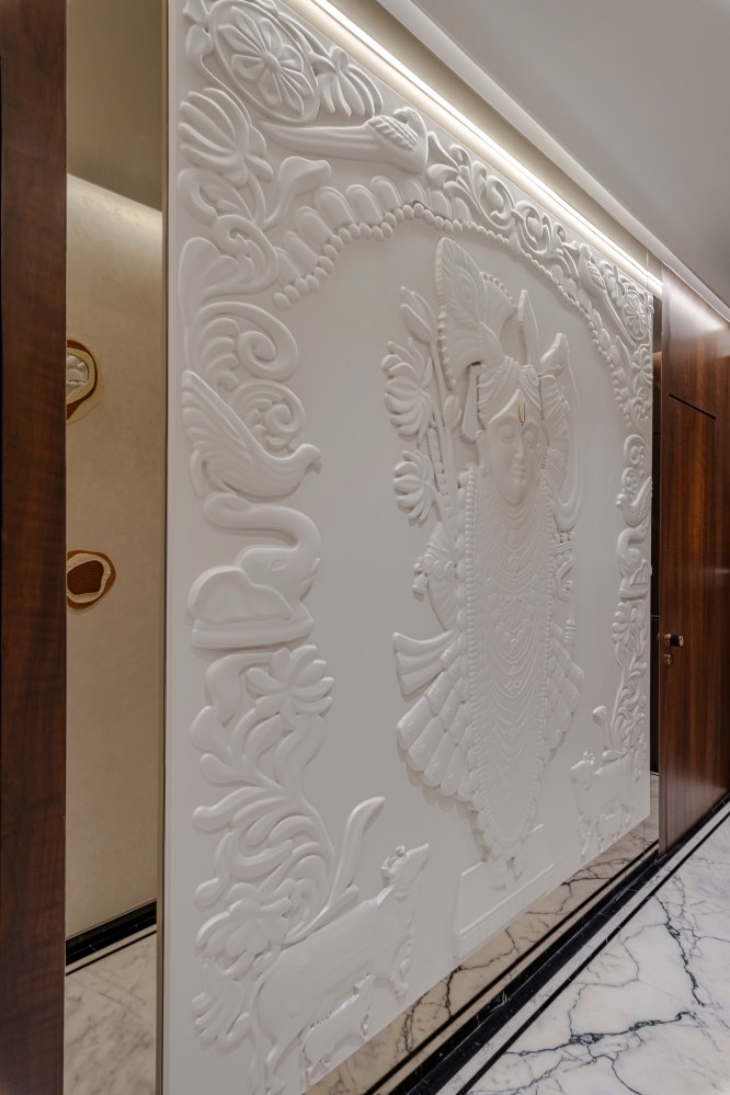 The entrance passage further deepens the visual story — one side adorned with a stunning Shreenathji wall mural, intricately sculpted in MDF, while the opposite wall displays handcrafted art pieces composed of POP, clay, and mirror. This pairing transforms the corridor into a gallery of artistic devotion and design refinement.