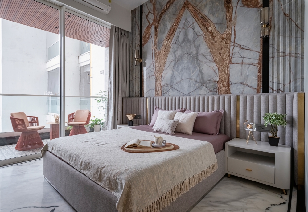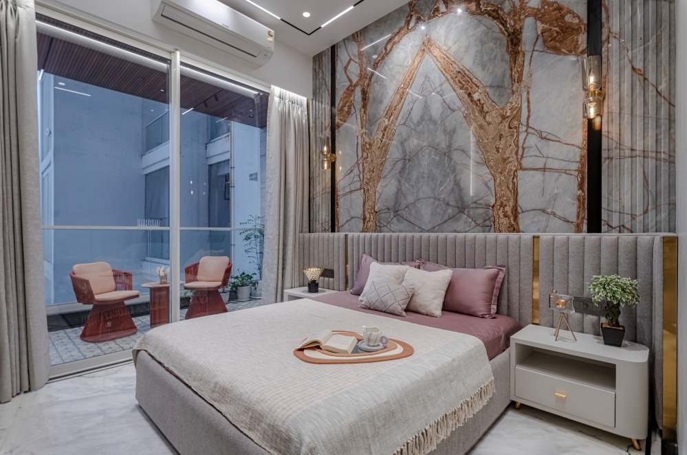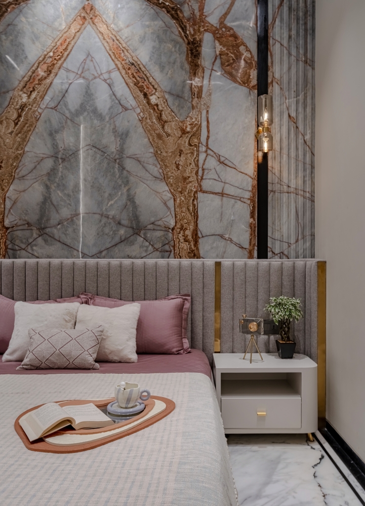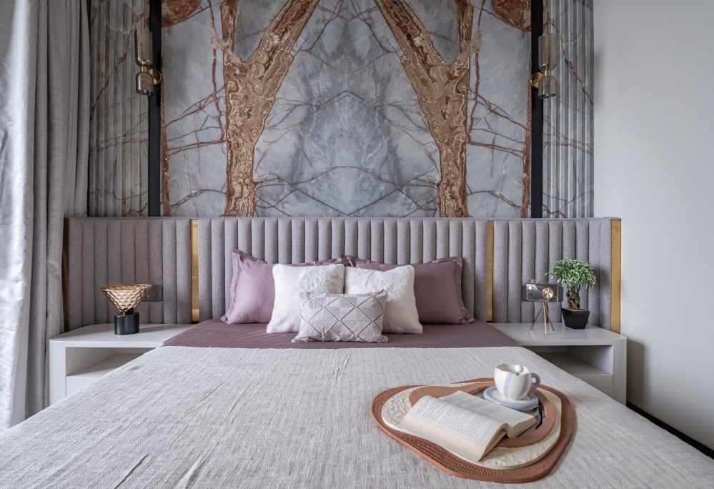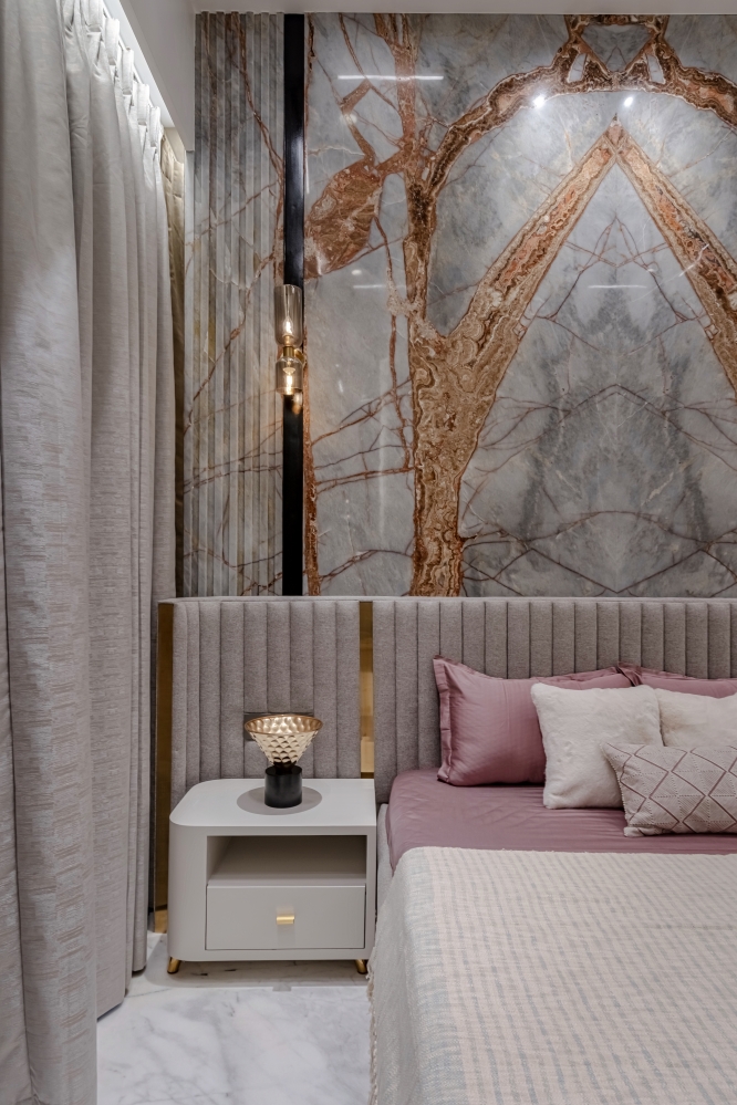 The parent’s bedroom exudes timeless elegance through its use of exotic book-matched marble forming a luxurious backdrop behind the bed. The long headboard stretches across the wall, integrating seamlessly with a gracefully curved side table.