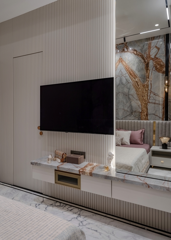 The TV unit is topped with marble, continuing the material narrative, while the fluted design on the flush door subtly echoes the rest of the home’s detailing. A full-length dressing mirror and sleek TV ledge add utility with sophistication, creating a tranquil, well-balanced retreat.