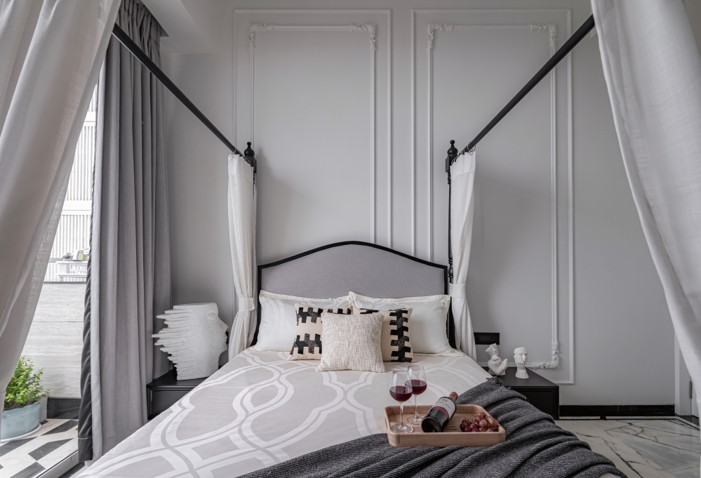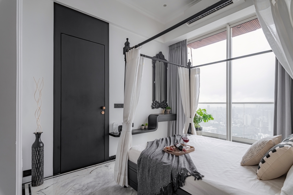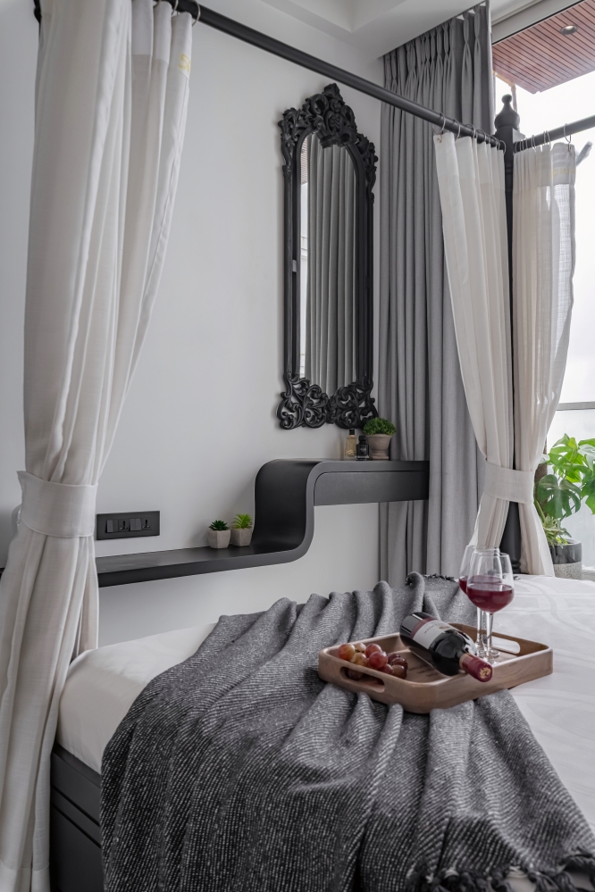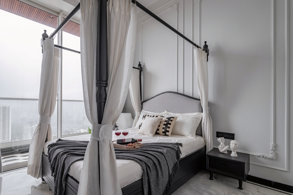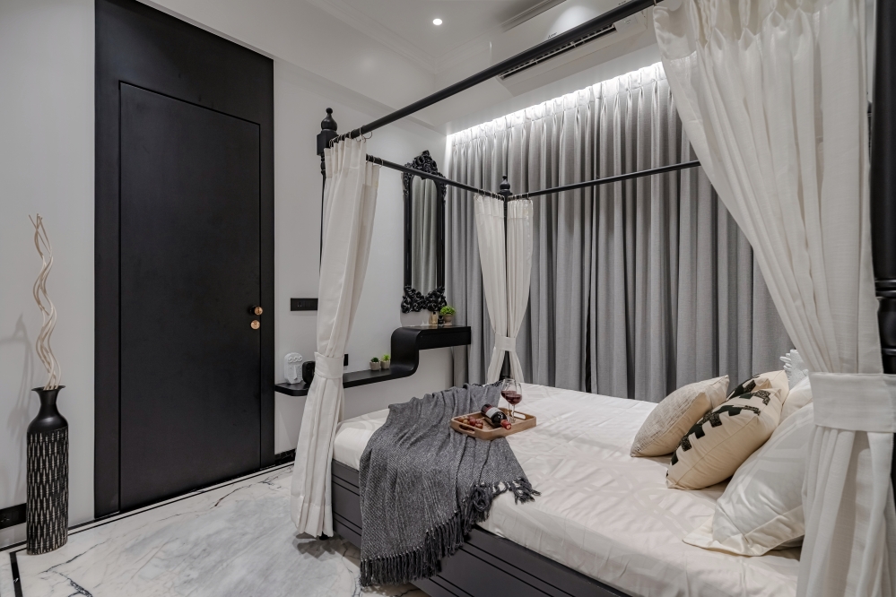 In this black-and-white bedroom, modern minimalism meets timeless luxury. The tall four-poster canopy bed establishes height and drama, softened by sheer curtains that create an intimate cocoon. Subtle wall moldings lend quiet refinement, while a carved wooden mirror and floating console bring texture and depth. The interplay of layered textiles, smooth marble flooring, and soft lighting ensures that the monochrome palette feels both inviting and elegant.
