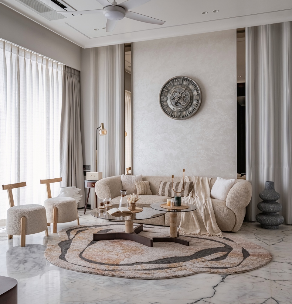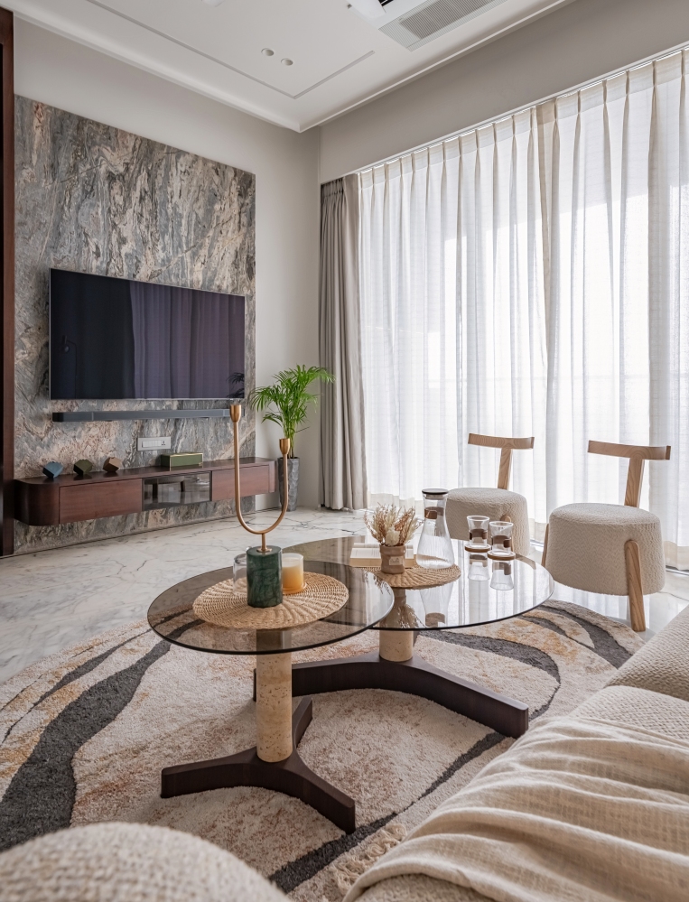 Warm veneer finishes across furniture surfaces anchor the palette in earthy richness, complemented by exotic Italian marble flooring throughout. The ceiling’s layered design, accentuated with concealed lighting, subtly defines zones while maintaining openness. Upholstered in soft neutral fabric, the sofa exudes comfort, while accent chairs in textured beige and full-length sand-toned linen drapes enhance the space’s calm and tactile sensibility.