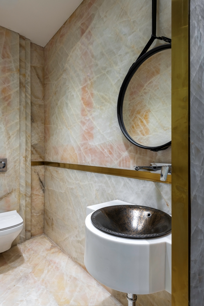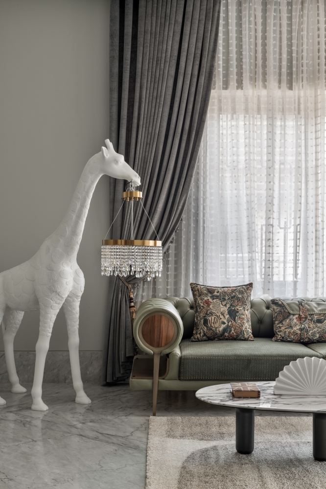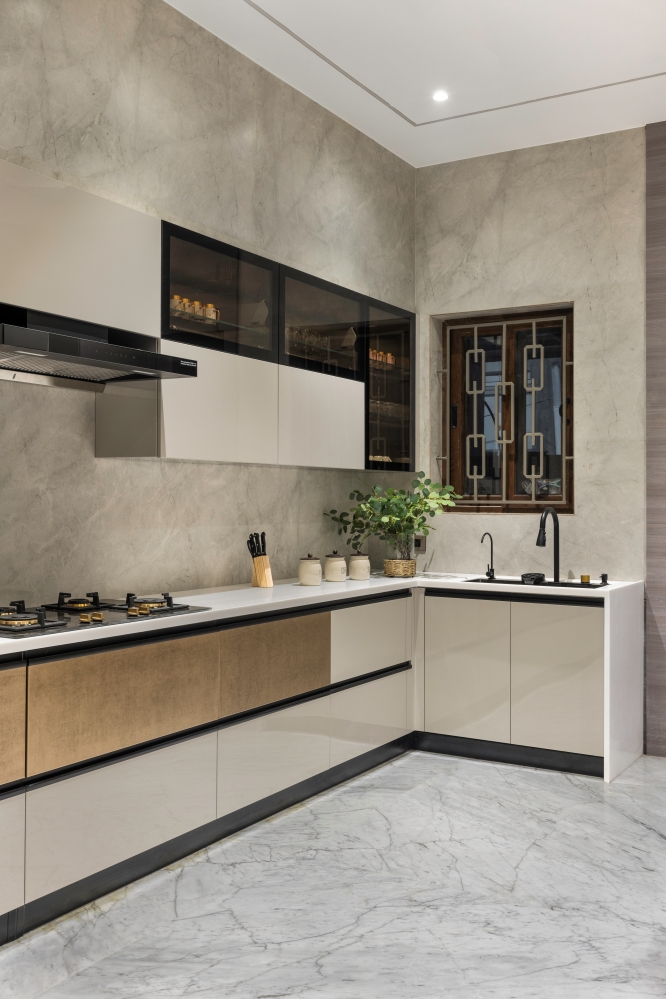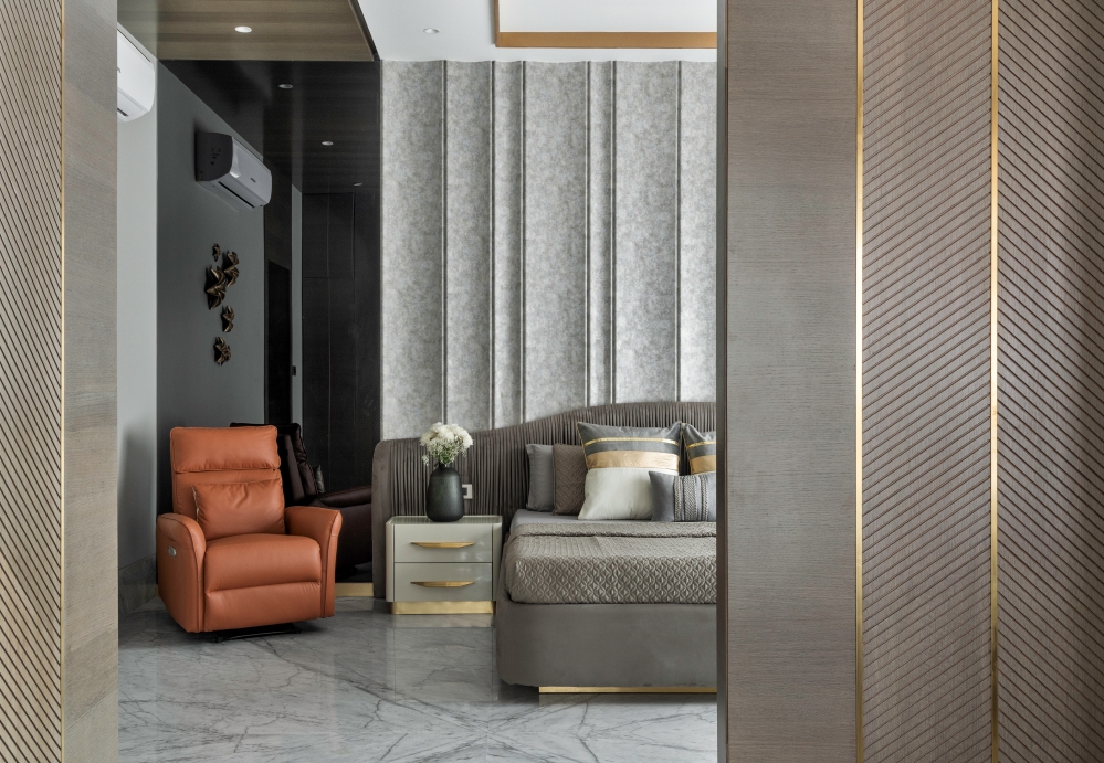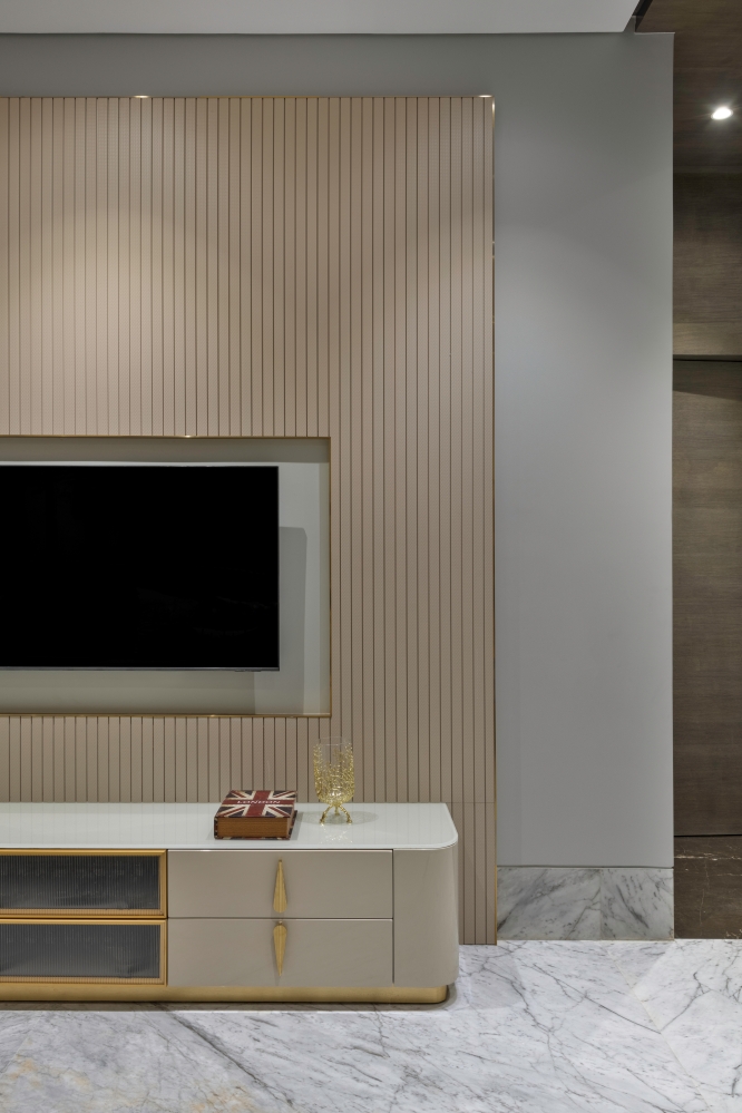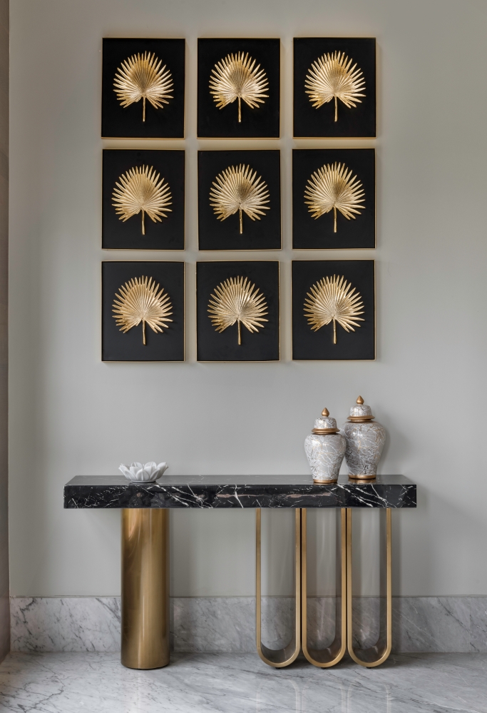 The overarching concept is rooted in understated opulence, where material strength and artistic expression work in quiet harmony. The décor language is defined by confident contrasts—metallic undertones, muted greys, and carefully placed bursts of colour create a striking yet balanced composition. Decorative surfaces and bespoke elements lend the interiors a curated, almost exhibition-like quality, while integrated storage remains discreetly embedded within the architecture, preserving visual clarity.