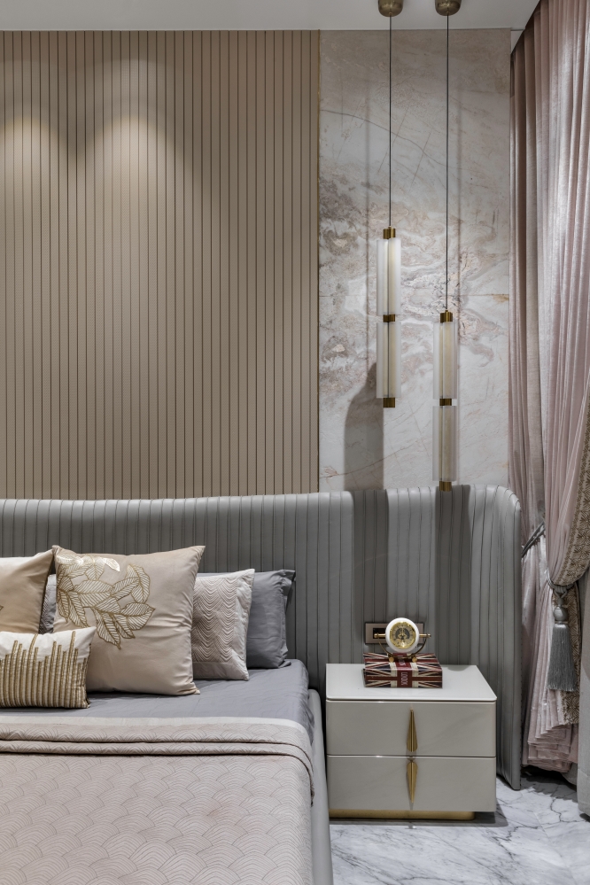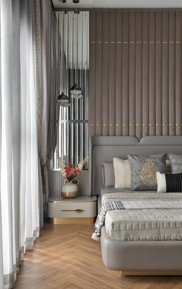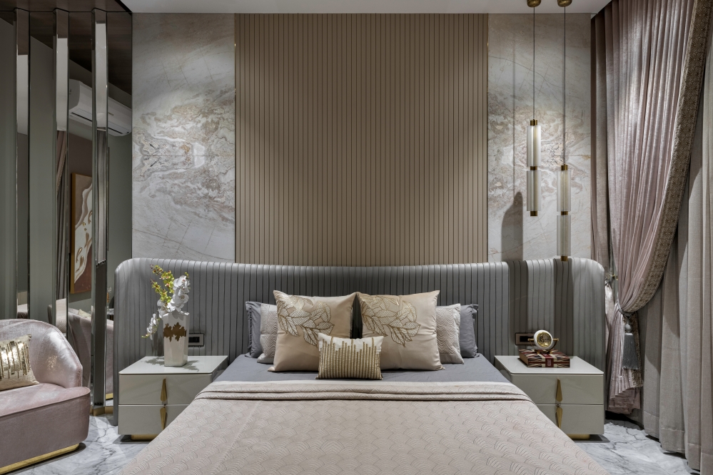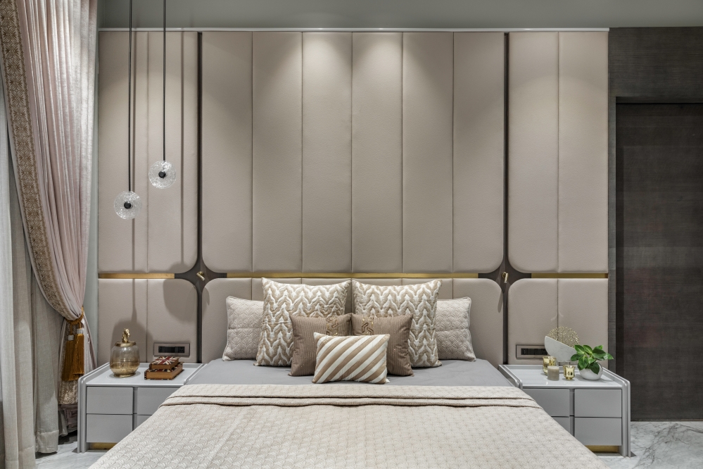 Moving to the master bedroom, a sense of modernism and art takes over, with a soothing palette of beiges and whites. The carefully selected decor pieces add a touch of sophistication, creating a harmonious retreat for the homeowners.