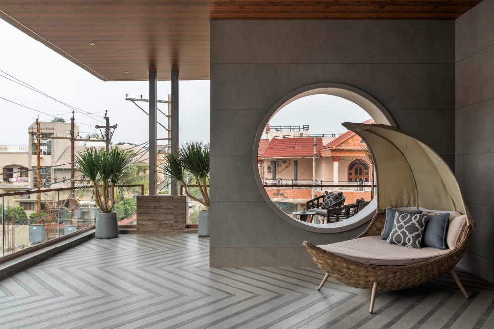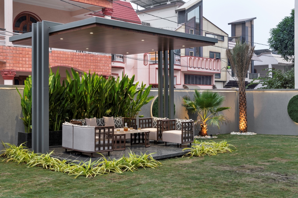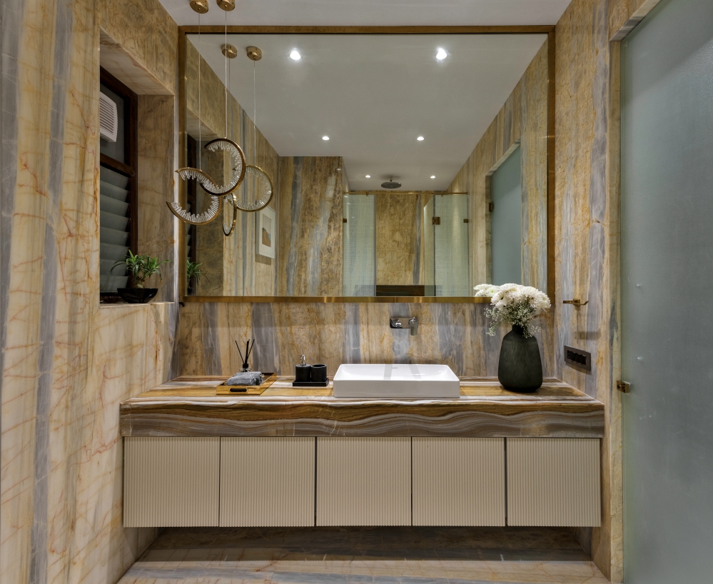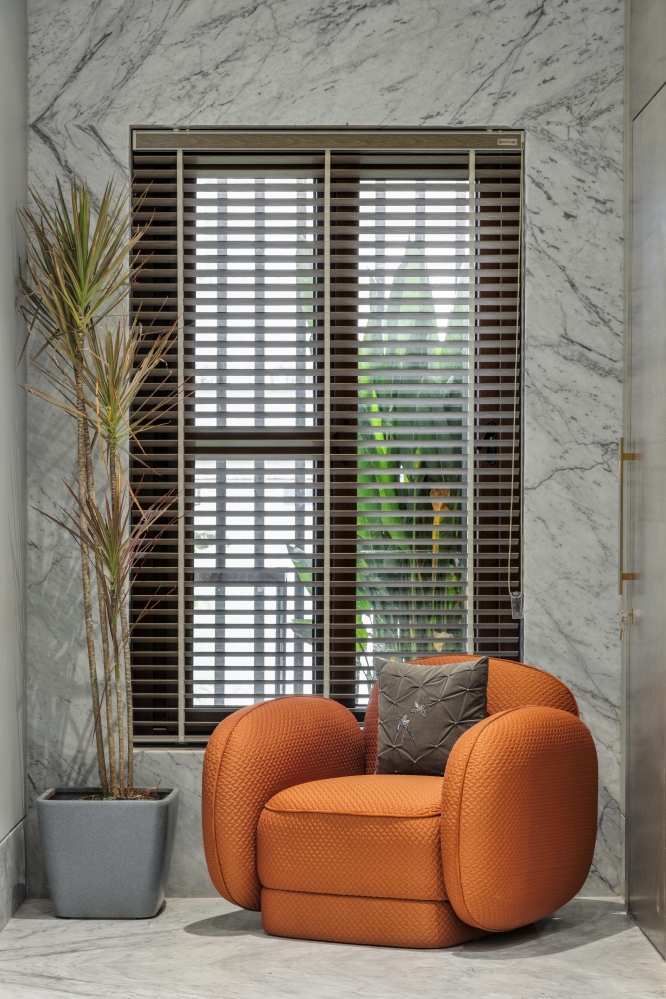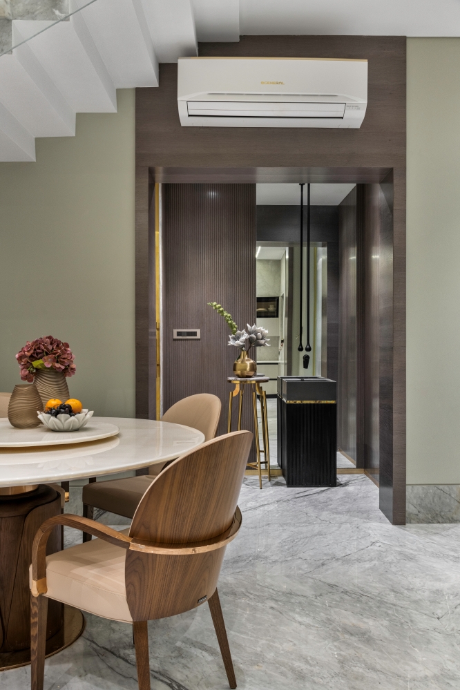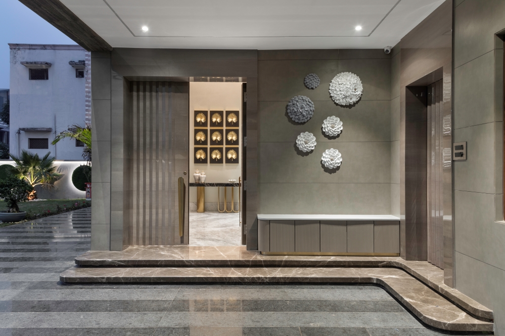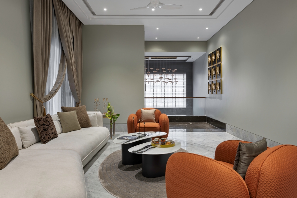 A softer palette of warm neutrals tempers the bolder accents, introducing a sense of ease and continuity across the home. Vertical volumes and art-led wall treatments add drama and spatial depth without overwhelming the senses. Opening outward, the outdoor sit-out is treated as a calm extension of the interiors, finished with subtle patterns and relaxed seating. Together, these elements craft a residence that feels poised, personal, and enduring—an interior where design intention and livability are seamlessly aligned.