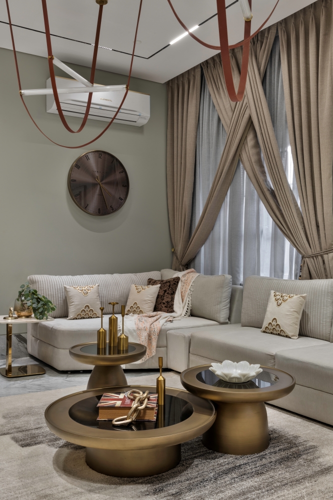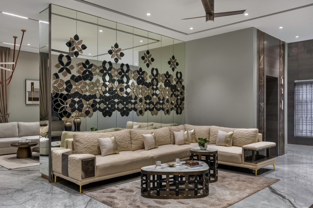The living room, a lavish space, is adorned with the designer mirror at the back, which takes center stage, infusing the room with a captivating oomph factor. The carefully curated art pieces find their place seamlessly, enhancing the overall ambiance and creating a living space that feels like a gallery in its own right.