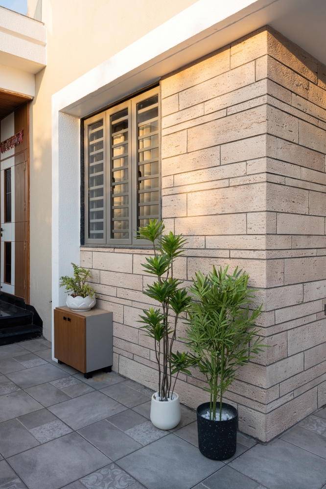 The exterior façade is articulated through clean geometries, neutral tones, and textured stone cladding that lends depth and permanence. Subtle linear details and a minimal boundary wall design enhance the contemporary character. At the same time, the clean structural composition and integrated planters soften the elevation, creating a balanced and refined street-facing façade.