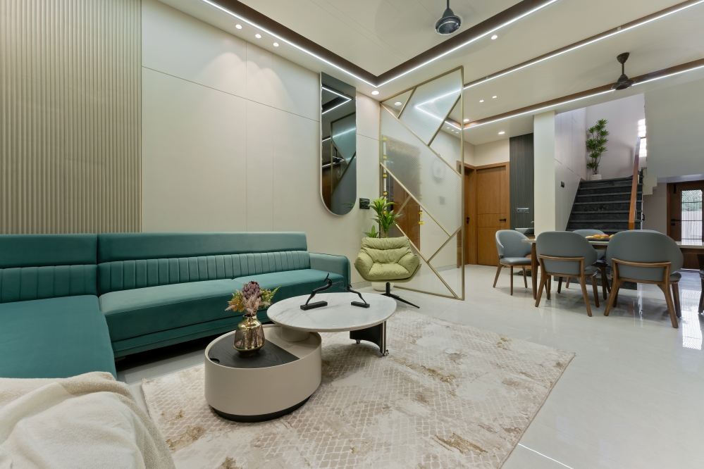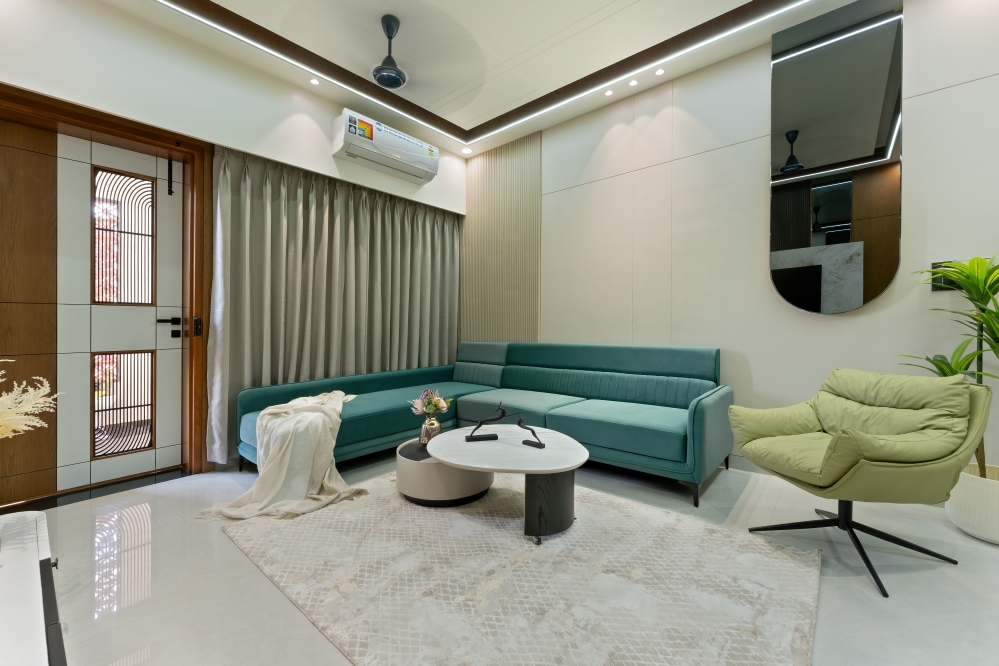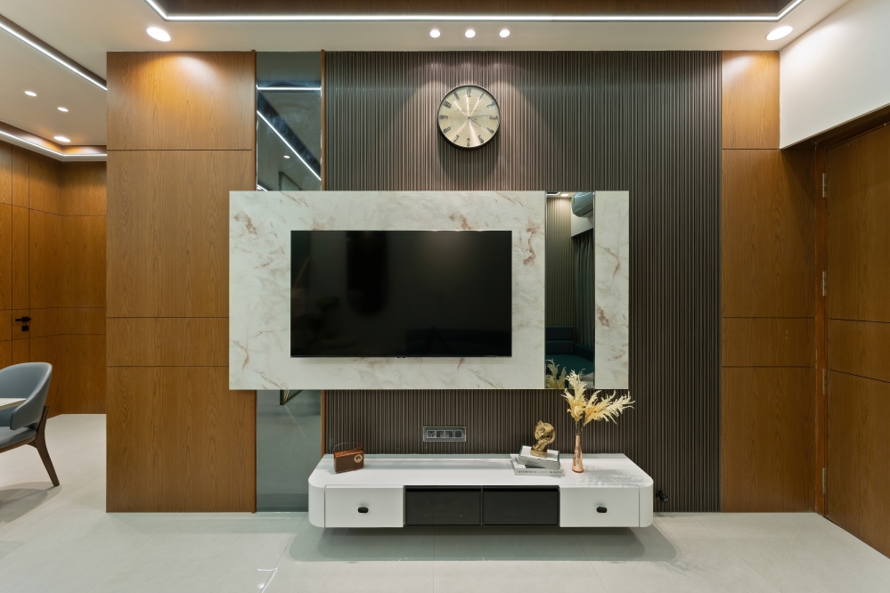 The living area unfolds as a well-balanced composition of comfort and sophistication. A plush sectional sofa anchors the space, paired with nested centre tables that add functionality without visual clutter. The TV unit becomes a statement element, featuring wooden panelling, fluted textures, and a marble-finished backdrop. Mirrors, soft furnishings, and a layered lighting scheme enhance spatial depth, while the neutral palette allows décor accents to subtly elevate the setting. Layered textures, plush furnishings, and elegant ceiling decor create a warm yet sophisticated space for relaxation and social gatherings.