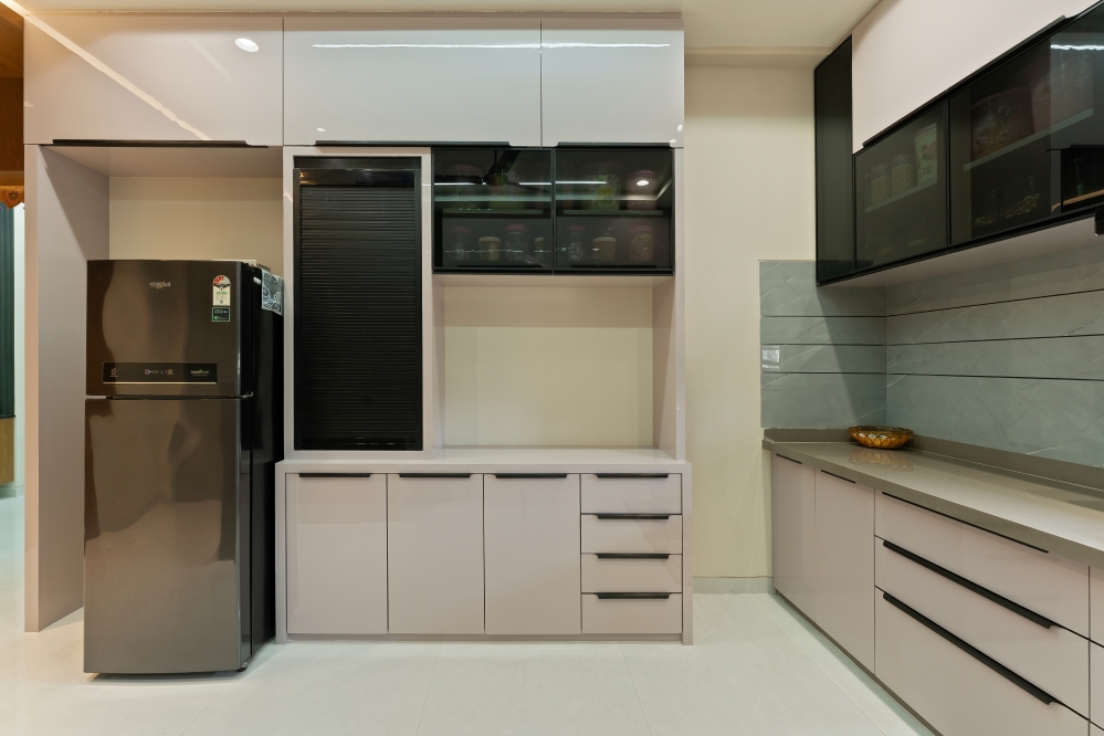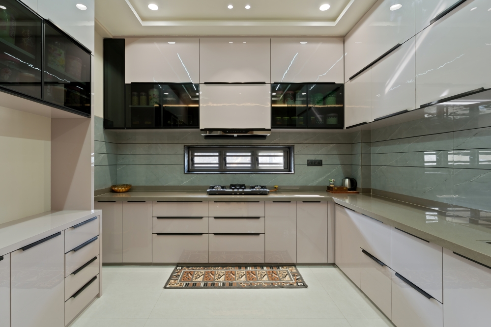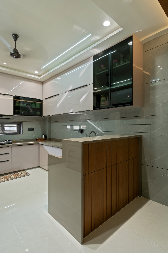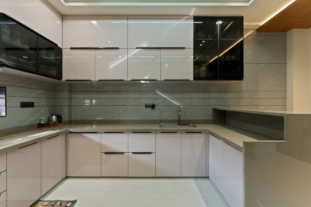 The kitchen is designed as a highly functional yet visually cohesive space. Modular cabinetry in glossy finishes is paired with wooden accents to introduce warmth. The kitchen features a polished countertop platform paired with a stylish backsplash, enhancing both functionality and contemporary aesthetics. Ample counter space, integrated appliances, and efficient storage solutions ensure ease of use, while reflective surfaces and concealed lighting enhance brightness and lend a polished, contemporary appeal.