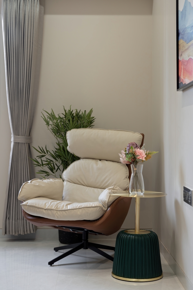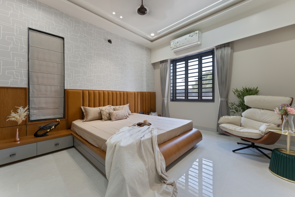 A bedroom is conceived as a tranquil retreat, anchored by an upholstered bed with a warm-toned cushioned headboard. Modern bed design with side tables and layered soft furnishings enhances comfort, while a lounge chair by the window creates a relaxed seating corner with a stylish table. The selection of grey textured wall accents and curtains adorns the bedroom elegantly. The walk-in closet is seamlessly integrated, featuring a dressing mirror, concealed storage, and ambient lighting that adds depth without overwhelming the space.