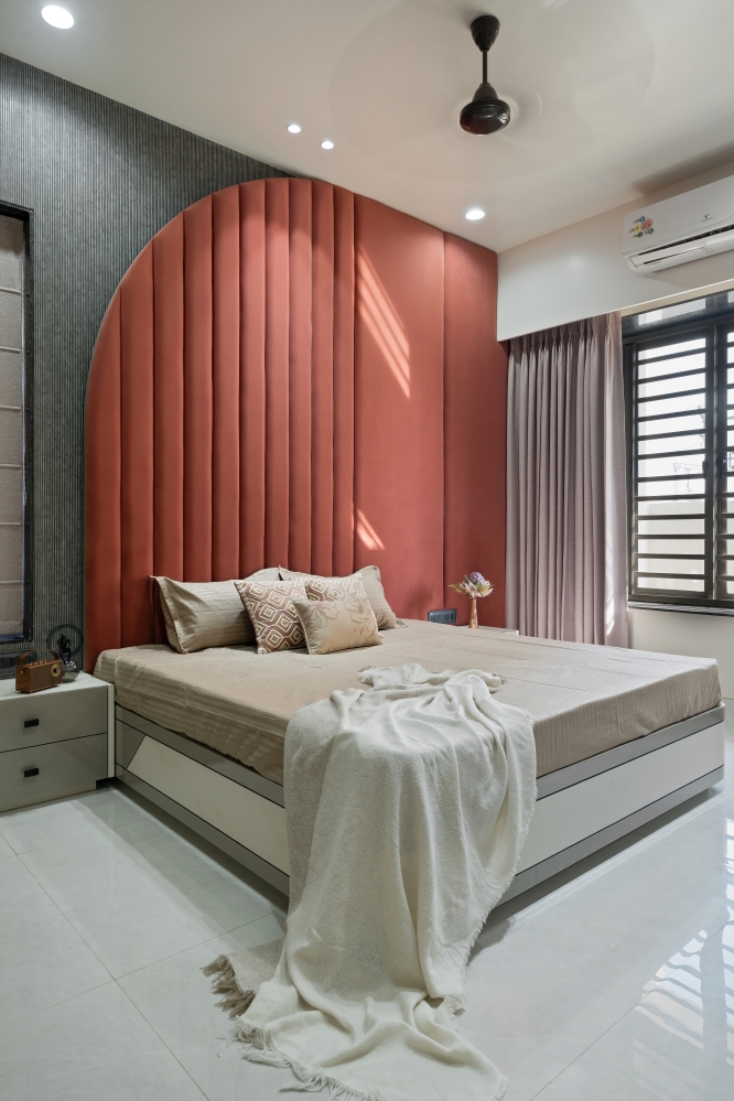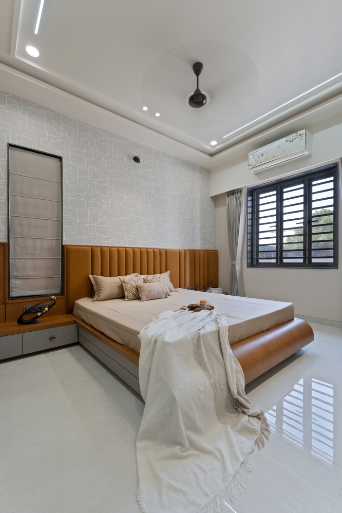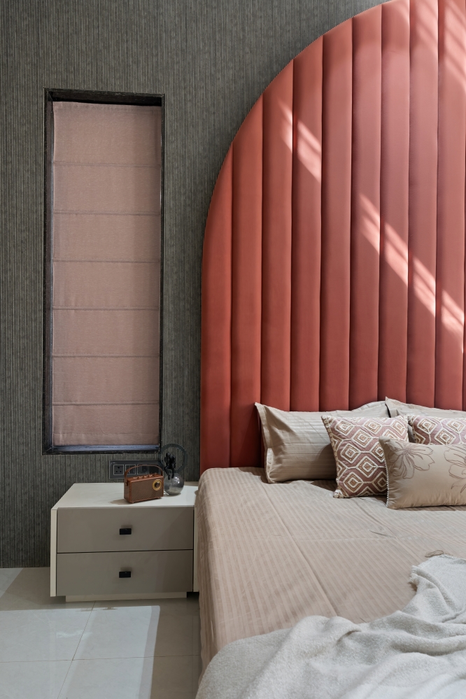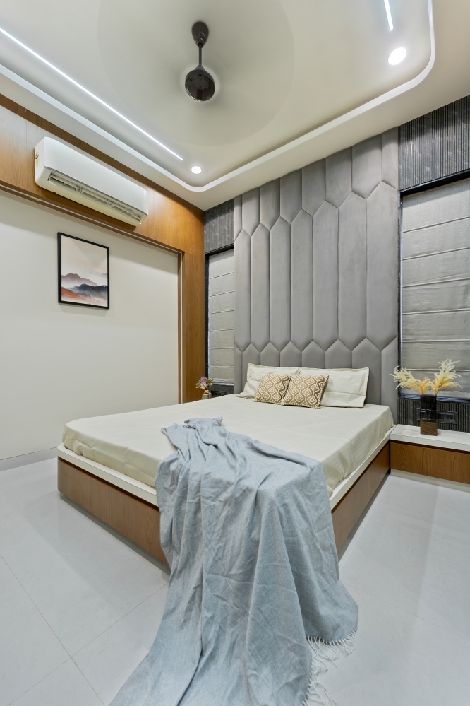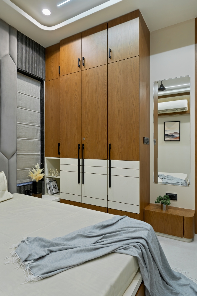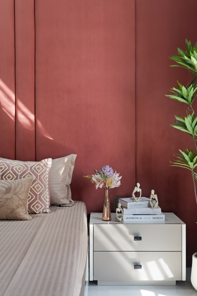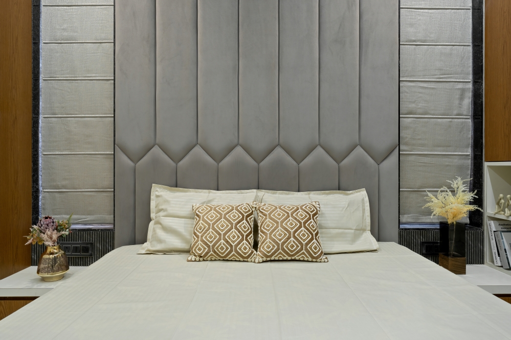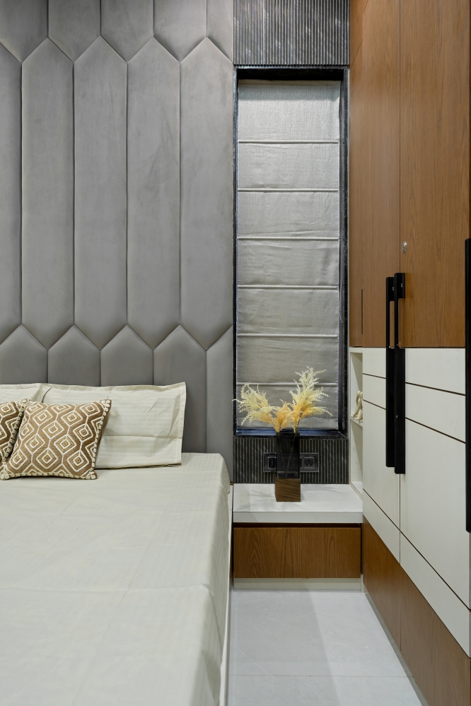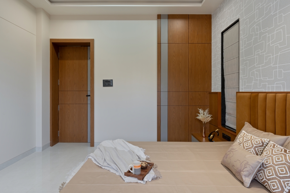 This minimal bedroom reflects a calm, modern character, defined by full-height cushioned panelling with subtle geometric detailing and a refined neutral colour palette. The bed is paired with minimal side tables and subtle décor accents to maintain visual clarity. A full-height wardrobe in contrasting finishes provides generous storage while reinforcing the room’s clean-lined aesthetic. Thoughtfully placed lighting completes the space with a calm, composed ambience.