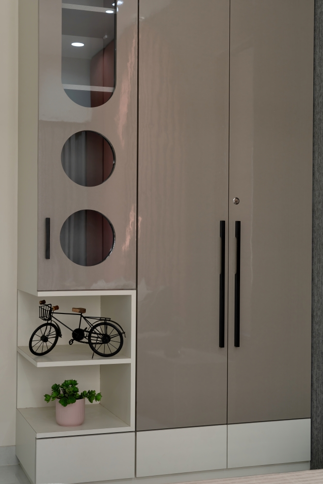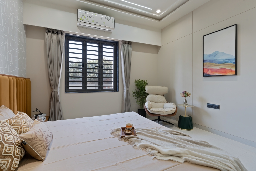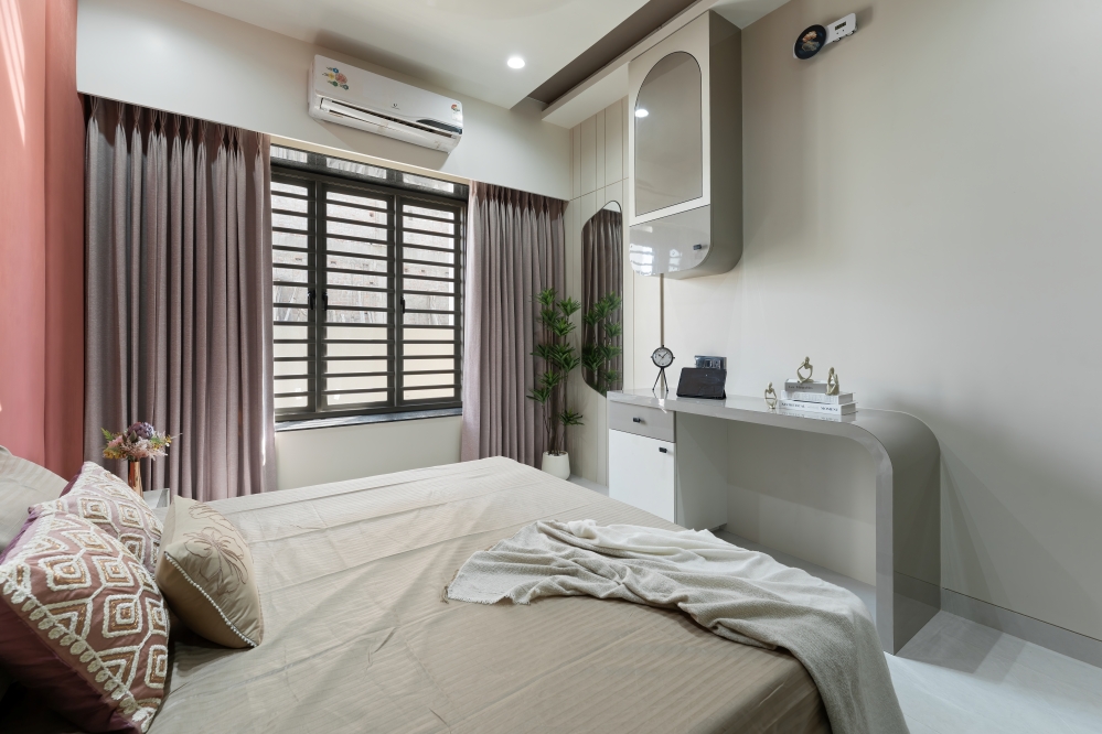This modern bedroom adopts a softer, more playful aesthetic through pastel accents and curved design elements. The bed is styled with textured linens and cushions, while the wardrobe incorporates clean lines with functional niches for display. A compact study with modern decor and a dressing unit enhances usability, and natural light filtered through curtains creates a bright yet calming atmosphere.