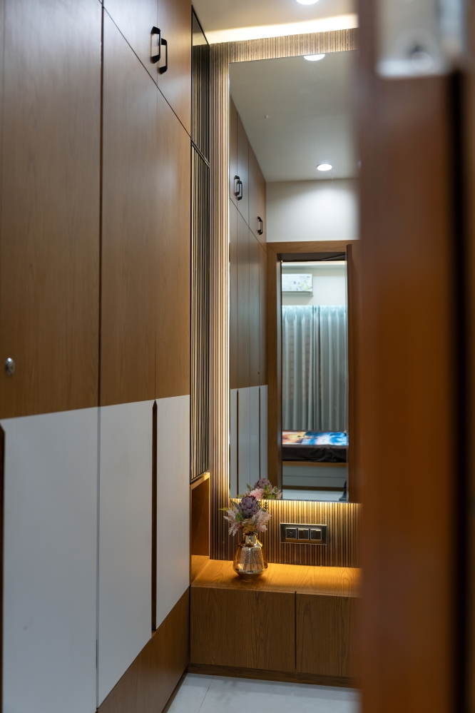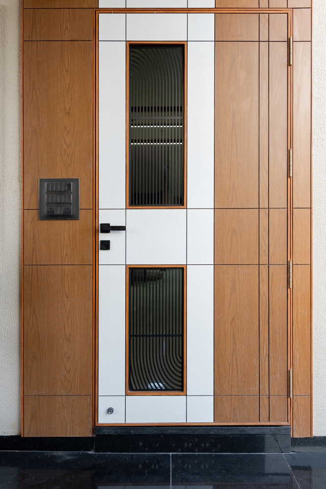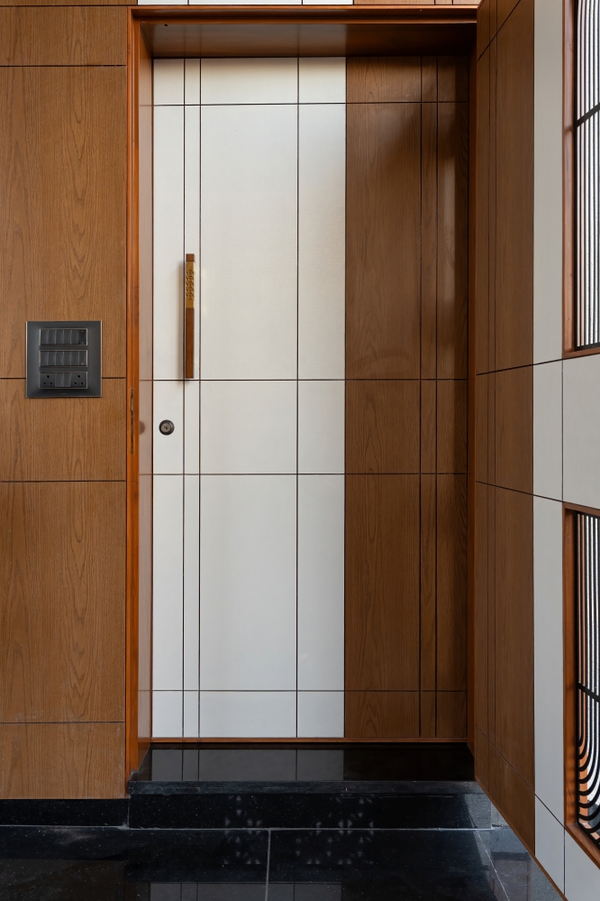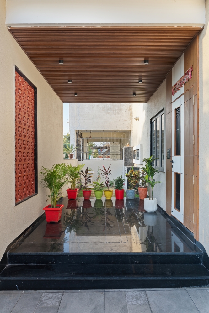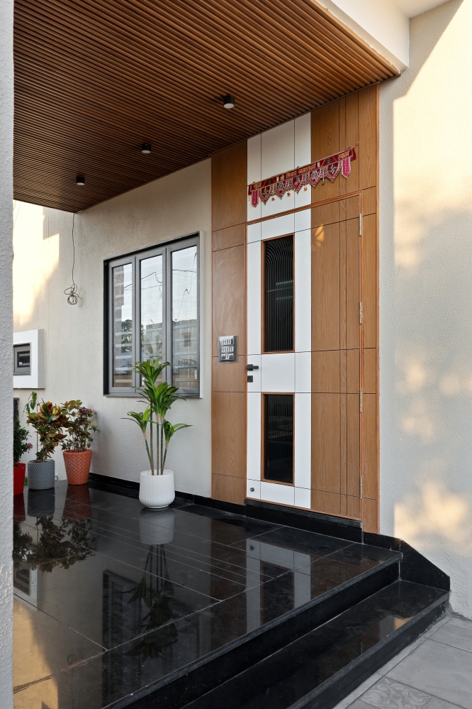 The entrance is designed as a refined threshold, marked by warm wooden panelling and a sleek main door with subtle white accents. Black stone flooring adds contrast and durability, while soft lighting and indoor plants introduce a welcoming ambience, establishing a calm and thoughtfully curated first impression. Soft lighting with wooden ceiling and carefully placed décor elements create a welcoming transition, reflecting the home’s understated contemporary character.