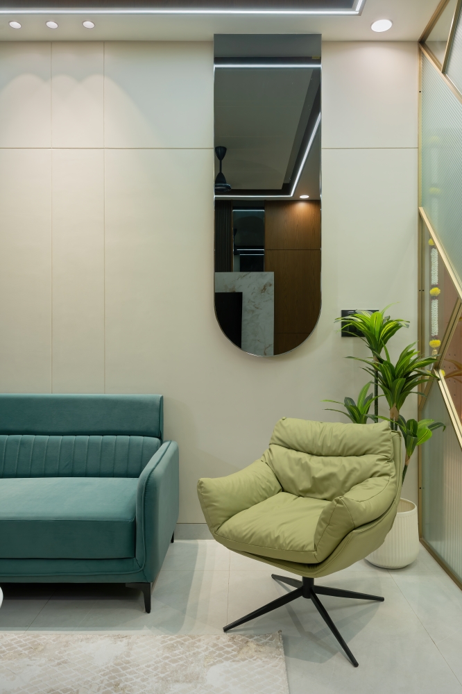 The Principal Designer shares that the vision for Krishna Kunj was to craft interiors that feel timeless yet responsive to everyday living. Emphasis was placed on seamless spatial flow, cohesive material transitions, and a restrained colour palette. Each area was carefully detailed to balance aesthetics with practicality, ensuring that furniture, lighting, and storage solutions integrate effortlessly into the overall design narrative.