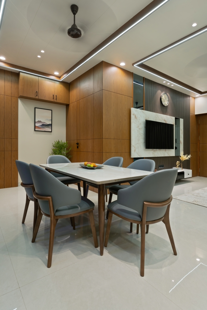 The dining area is defined by a modern dining table complemented by upholstered chairs that offer both comfort and visual elegance. Positioned to maintain connectivity with the living space, it features warm wooden wall panels and focused ceiling lighting. Minimal décor and clean lines ensure the space remains uncluttered, while thoughtfully selected furniture and ambient lighting make the dining area both inviting and elegant, perfect for family meals and entertaining guests.