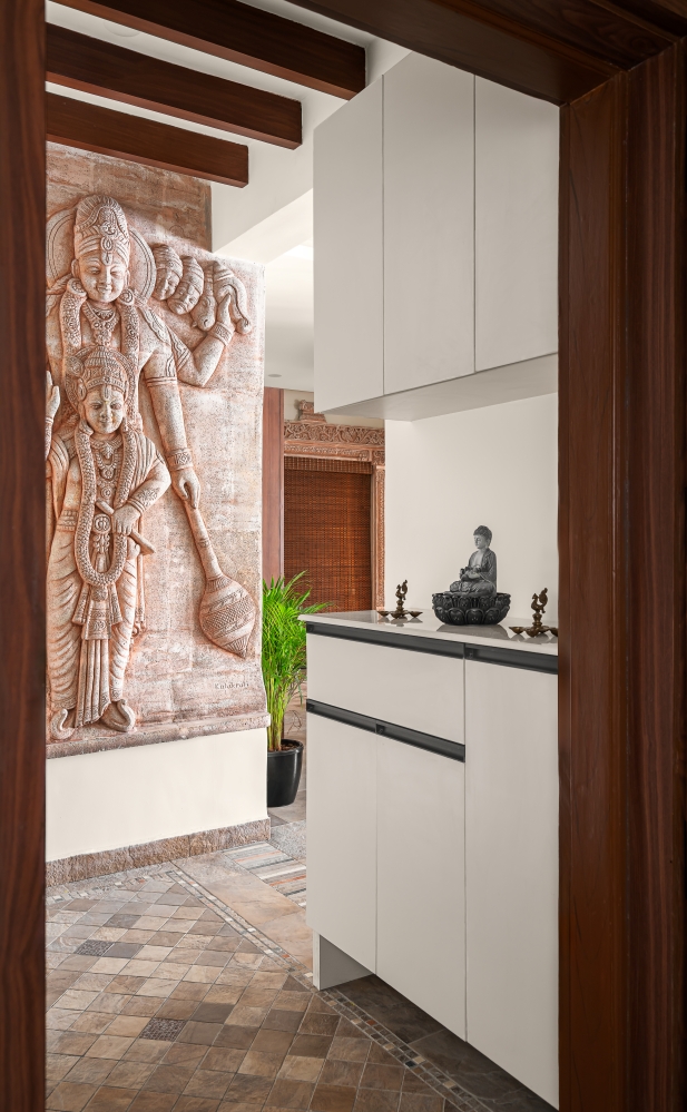 The entrance sets a refined and culturally rooted tone, anchored by a sculptural relief panel that has been part of the home for over 15 years and was intentionally retained as the primary focal point. Designed around this existing element, the space was subtly enhanced with a streamlined shoe rack in a muted finish, ensuring functionality without visual clutter. Warm wooden framing, exposed wooden rafters, and a complementary ceiling treatment introduce the material palette, while earthy toned flooring creates a seamless transition into the living areas beyond.
