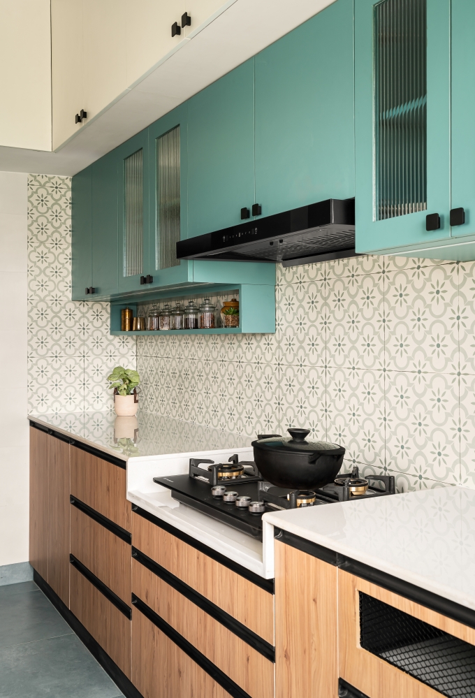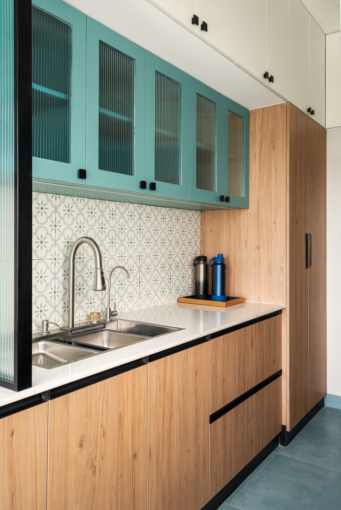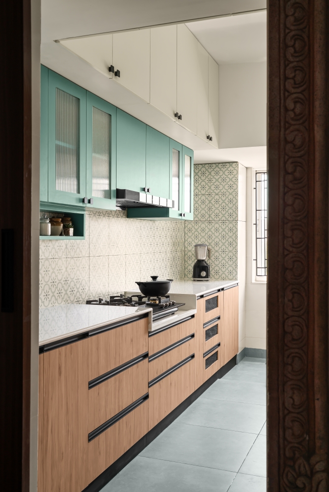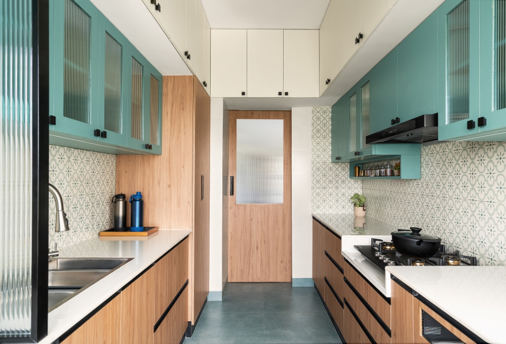 The kitchen is designed as a galley layout, prioritising functionality, ease of movement, and enhanced storage. Natural wood laminate base cabinets are paired with duck egg blue overhead units, introducing a soft freshness while maintaining visual calm. Storage is carefully optimised across both runs for maximum efficiency.
