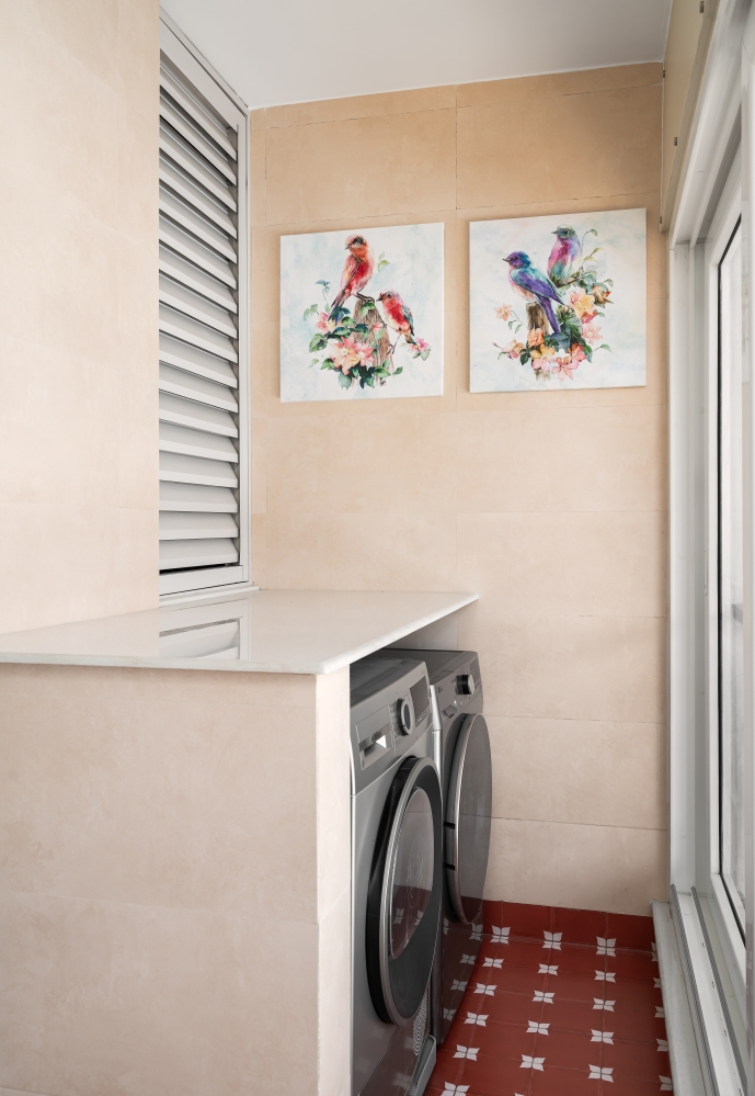 The balcony is reimagined as a compact, efficient utility zone. Full height wall tiling ensures durability and easy maintenance, while a counter above the washing machine doubles as a practical folding surface. Patterned floor tiles add visual interest, and sliding windows allow ample light and ventilation within the compact footprint.