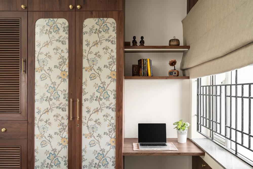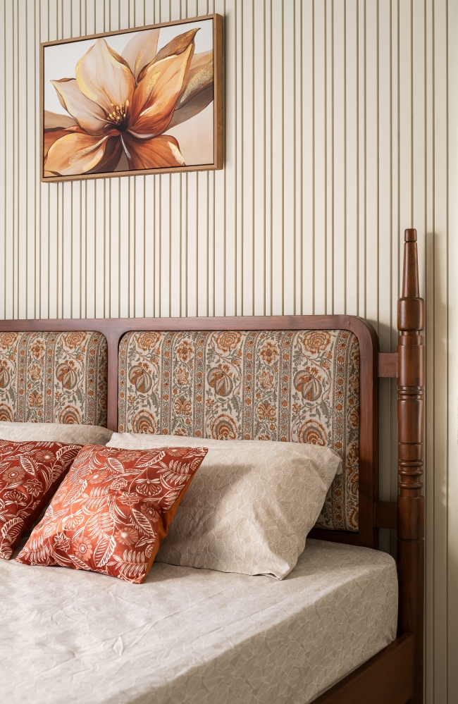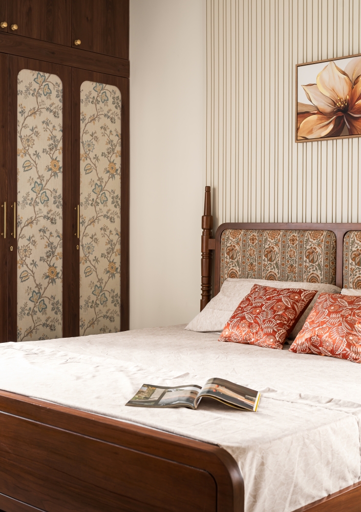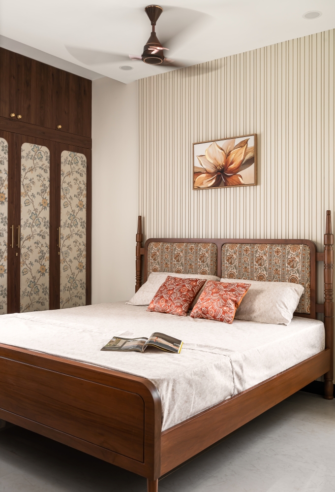 The master bedroom unfolds as a calm, personal retreat shaped by warmth and restraint. The space is anchored by a custom made cot, detailed with a floral upholstered headboard that adds softness and familiarity. Full height wardrobes in rich wood laminate feature fabric sandwiched panels, breaking the visual mass and introducing tactile depth. A discreet study ledge by the window is seamlessly integrated, supporting everyday use while maintaining visual flow. Neutral wall finishes and subtle panelling create a quiet backdrop, allowing the handcrafted details to take focus and lending the room a restful, intimate quality.
