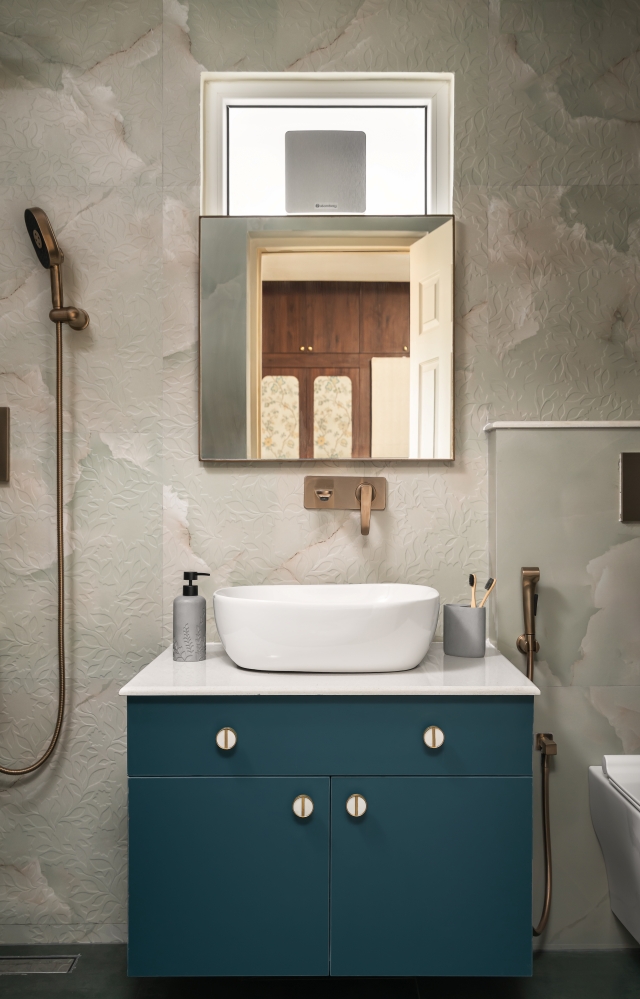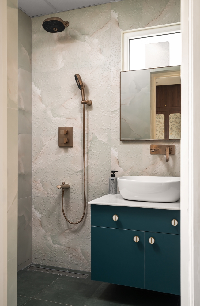 The master washroom carries forward the home’s refined material language with a calm, cohesive approach. A deep teal vanity anchors the space, paired with a crisp white sanitary setup and warm brass toned fittings that add understated elegance. Large format onyx effect tiles, detailed with subtle texture, are used to visually expand the compact washroom while introducing depth and softness. A clearly defined shower zone ensures functional clarity, allowing the space to feel organised, spacious, and quietly luxurious despite its modest footprint.