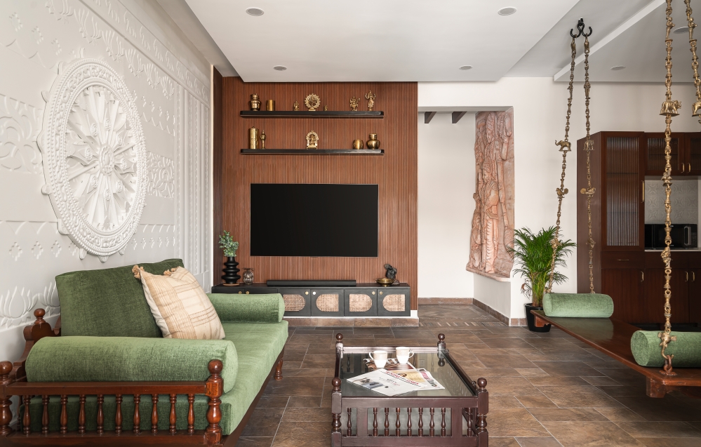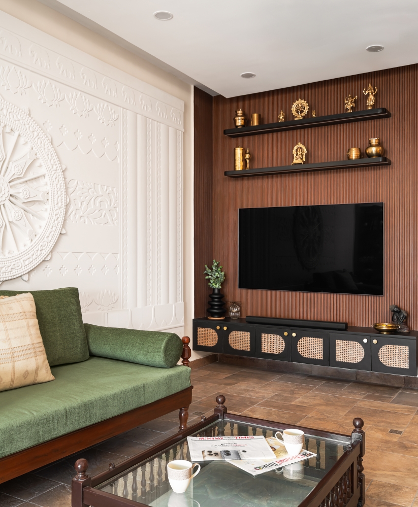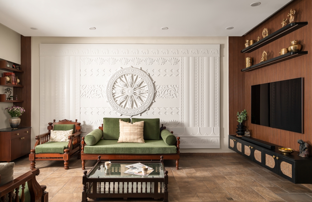 The living room unfolds as a refined dialogue between tradition and contemporary restraint. A sculptural mural wall, CNC cut and meticulously painted on site, forms the visual anchor of the space. Rooted in cultural expression, the design draws inspiration from the Ashoka Chakra at Konark, lending depth, symbolism, and quiet grandeur to the setting. Complementing this focal wall, vertical wooden slats frame the TV unit, their linear rhythm balancing the ornate backdrop with warmth and texture.