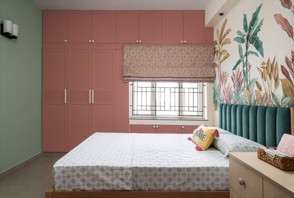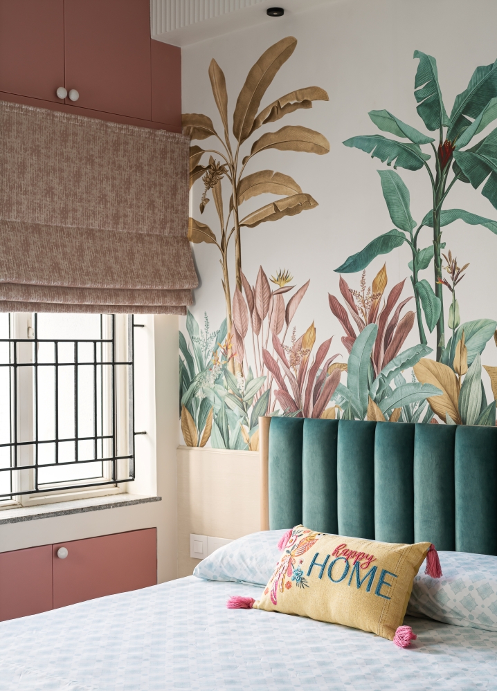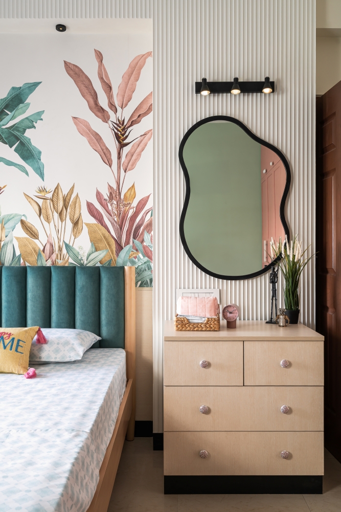 The daughter’s bedroom blends youthful vibrancy with enduring design. A custom bed with a vertically tufted headboard in deep teal anchors the room against a botanical feature wall. Floor-to-ceiling wardrobes in muted blush laminate integrate open display niches, while a compact dresser paired with an organically shaped mirror softens the linear composition. Matte finishes and layered textures create a space that feels expressive yet thoughtfully composed for evolving needs.