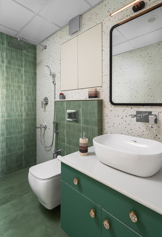The washroom features a lively yet balanced palette. Green kitkat tiles introduce a subtle vertical rhythm, paired with a coordinated vanity accented by unique metallic knobs. Terrazzo-inspired surfaces add subtle character, while clean-lined fixtures maintain a crisp and efficient layout.