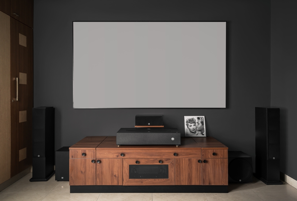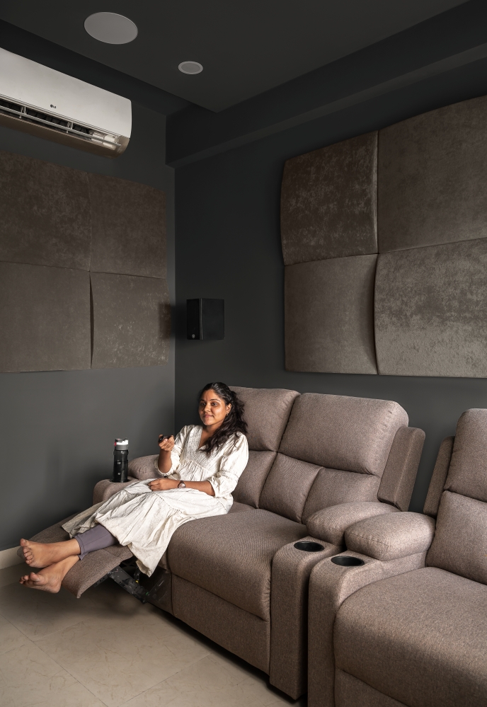 The home theatre is designed as a moody, immersive haven, where layered tones and subdued lighting intensify the cinematic atmosphere. A wooden media console with integrated storage anchors the projection system with a clean, streamlined presence. Acoustic wall panels refine sound quality while adding subtle depth and texture to the interiors. Recliner seating upholstered in a neutral fabric ensures comfort during extended viewing. Controlled lighting and a restrained colour scheme create a cinematic experience distinct from the rest of the home.