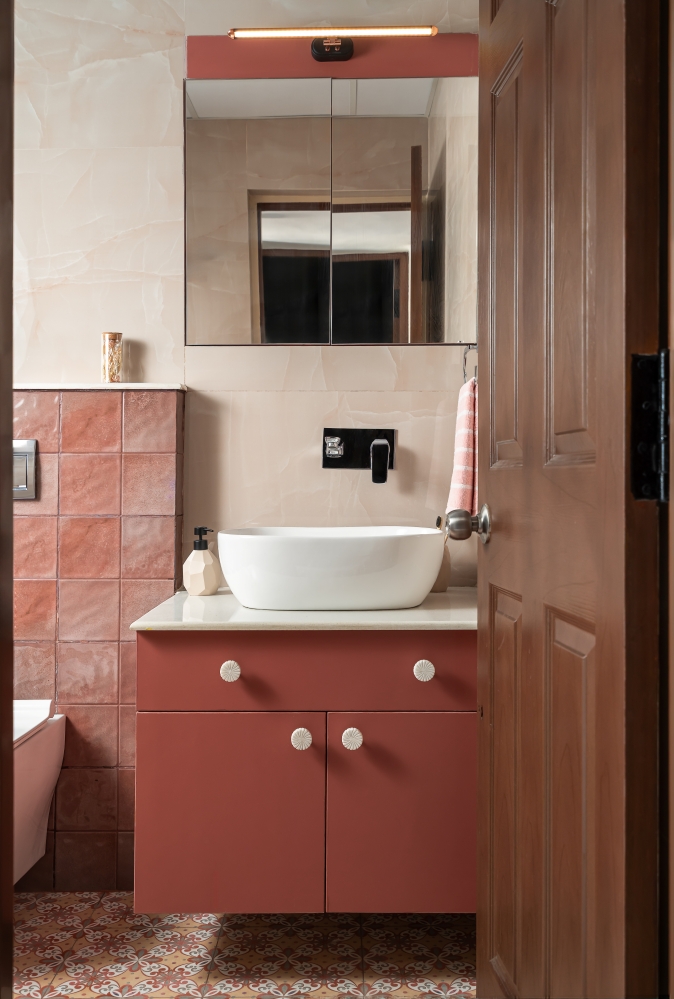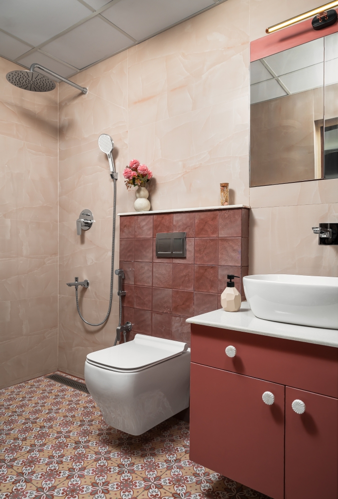 The guest washroom is defined by a warm, welcoming palette. A floating terracotta-finished vanity paired with a white countertop basin anchors the space, while dual-tone wall tiles add layered depth. Patterned flooring enhances visual character, and streamlined fittings ensure a crisp, uncluttered finish.