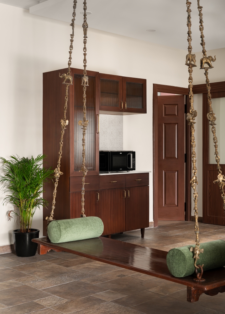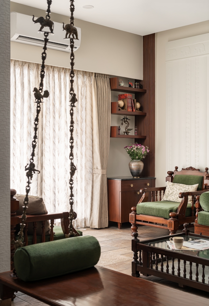 The clients’ existing solid wood seating with traditional turned detailing was thoughtfully retained and revitalised with new muted green upholstery, allowing heritage pieces to blend effortlessly with the refreshed aesthetic. A handcrafted coffee table anchors the arrangement, while a suspended wooden swing introduces a sense of nostalgia and gentle movement. Brass accents and curated artefacts complete the composition, resulting in a living space that feels layered, culturally rooted, and cohesively contemporary.